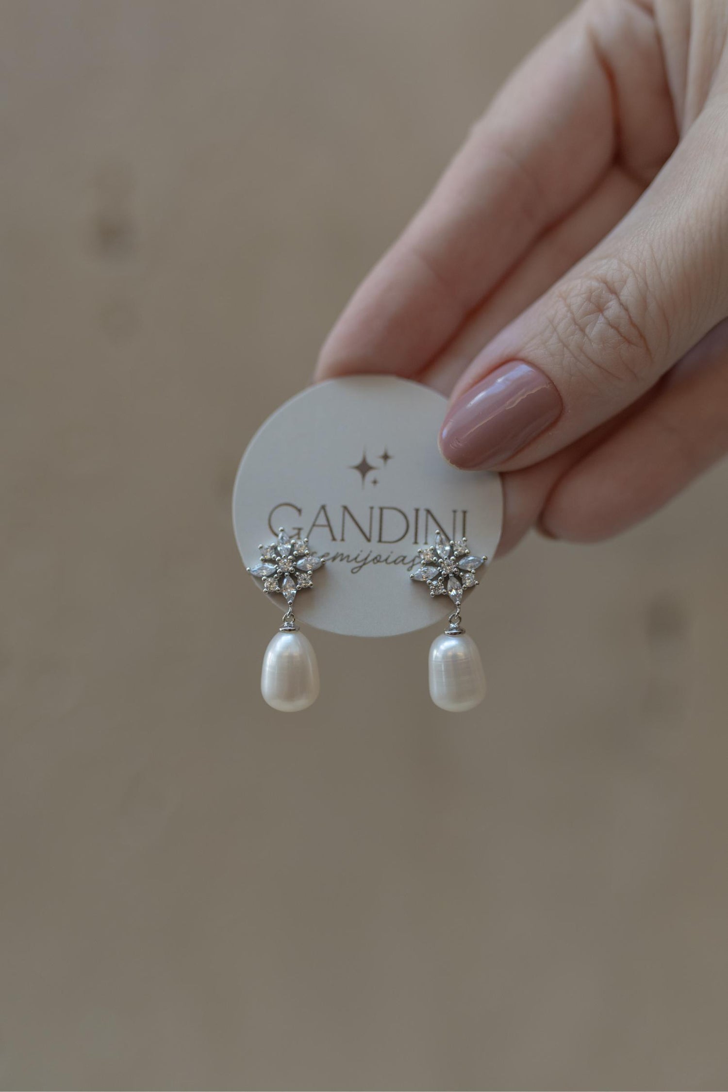 Brinco Flor Navetes Pérola de Água Doce Prata 925 Ródio Branco