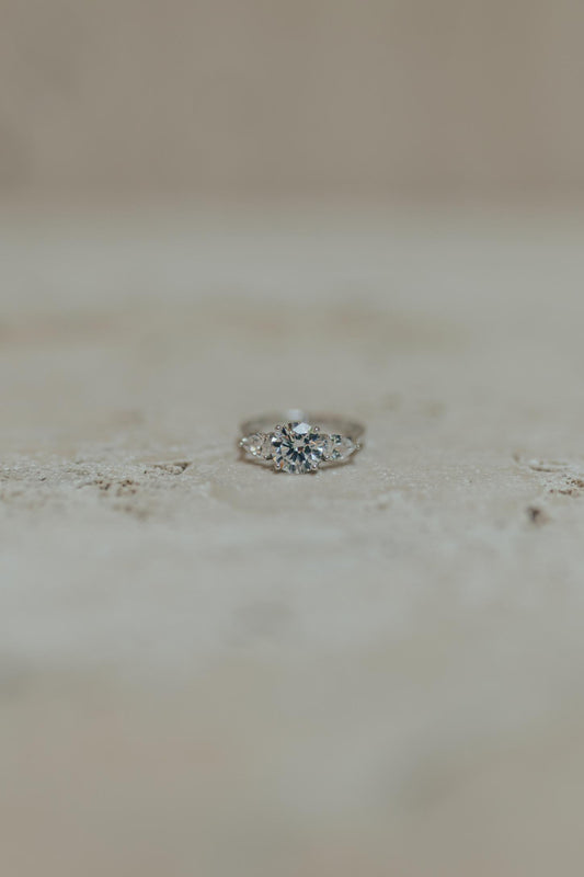 Anel Solitário 2 Gotas e Redondo Central Moissanite Prata 925 Ródio Branco