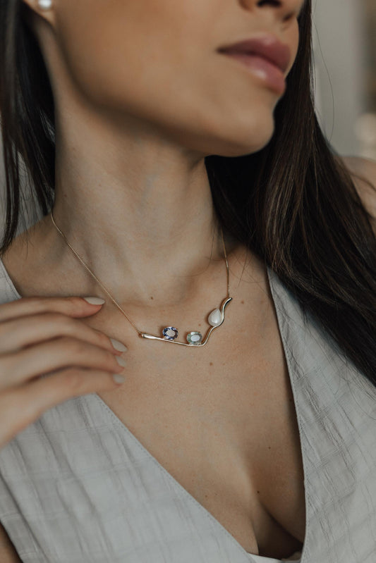 Colar Pingente Orgânico Zircônias e Pérola Dourado