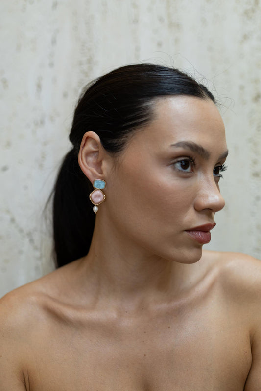 Brinco Resina Quadrado Colorido Pérola Dourado