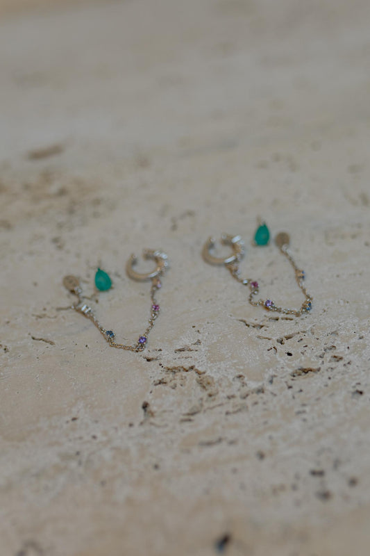Brinco Ear Jacket Esmeralda Colombiana 6 Gotinhas Prata 925 Ródio Branco