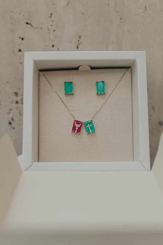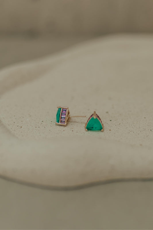 Brinco Triangular Fusion Esmeralda E Turmalina Rosa Dourado