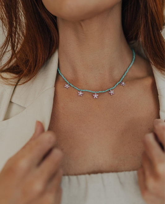 Colar Turquesa com 5 Pingentes de Flor Prata 925 Ródio Branco