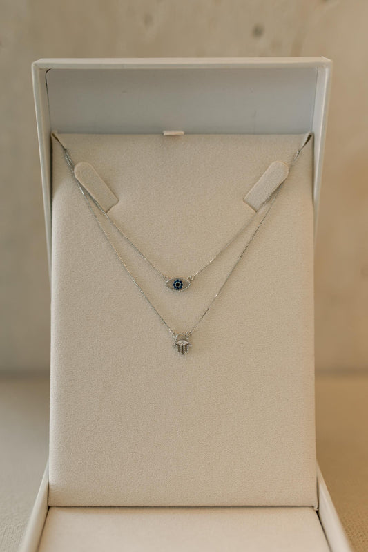 Colar Escapulário Olho Grego e Mão Hamsá Ródio Branco