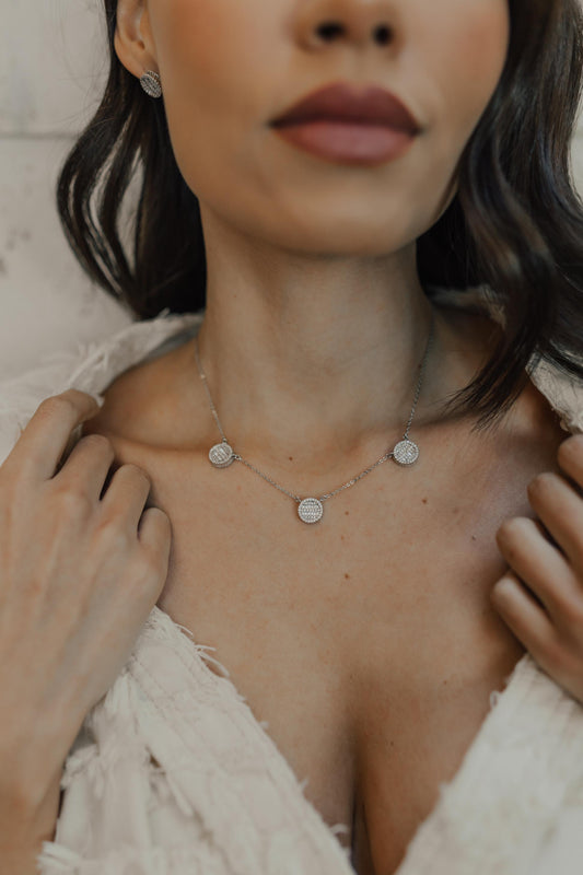 Colar com 3 Pingentes Redondo Baguete Ródio Branco