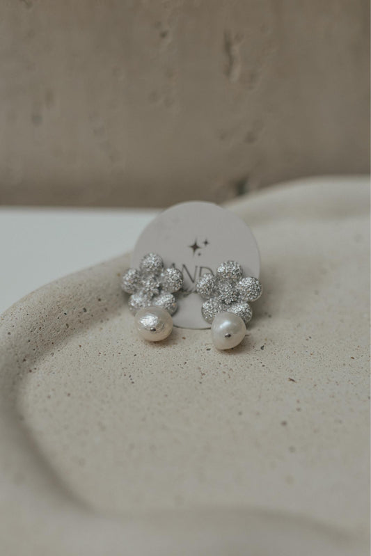 Brinco Base Flor Cravejada 5 Pétalas Pérola Barroca Prata 925 Ródio Branco