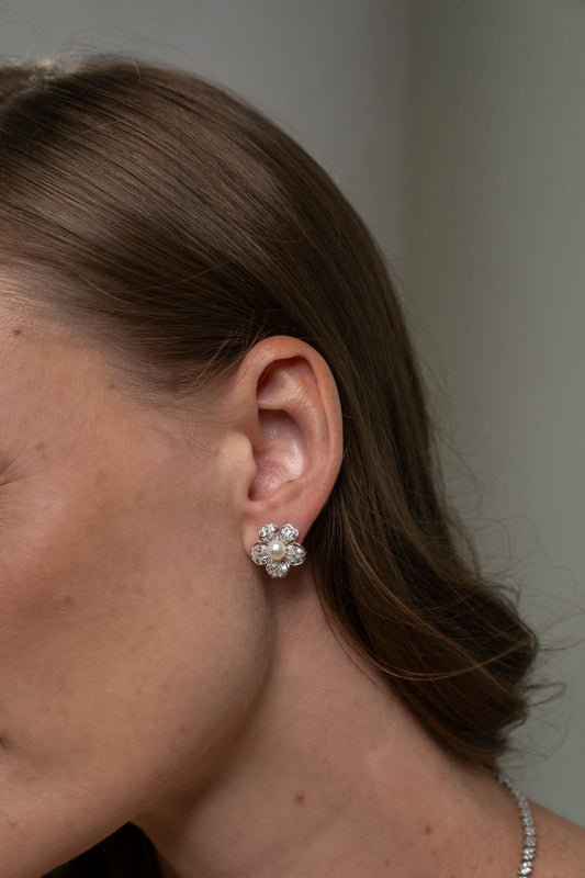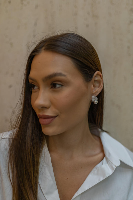 Brinco Fixo Flor Pérola Ródio Branco