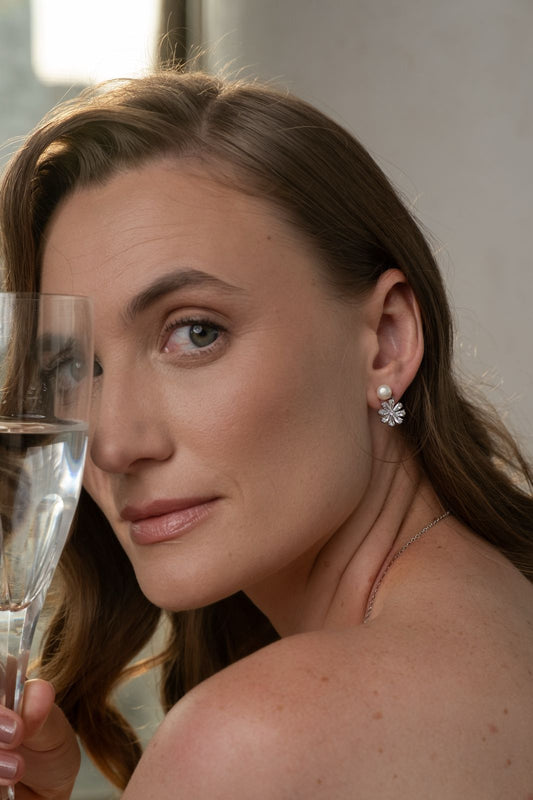 Brinco Flor Cravejada Prata 925 Com Pérola Ródio Branco