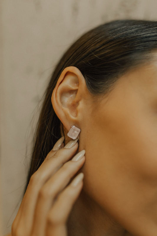 Brinco Solitário Retangular Quartzo Rosa Ródio Branco