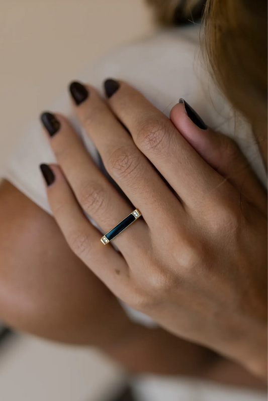 Anel Frente Quadrada Esmaltado Preto Dourado