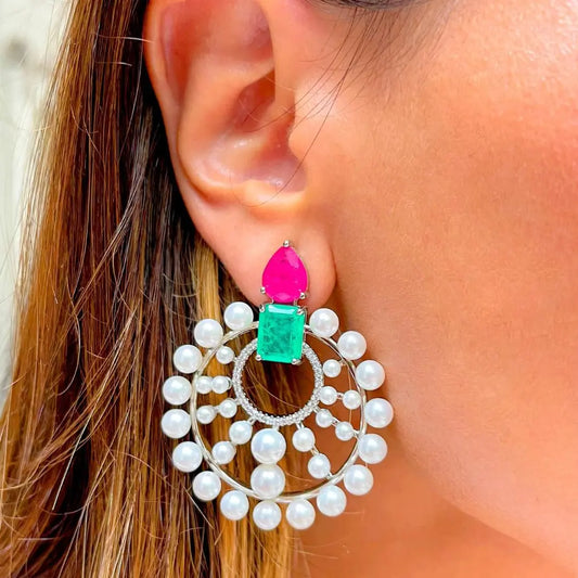 Brinco Redondo Pedra Fusion Rosa e Verde e Pérolas Ródio Branco