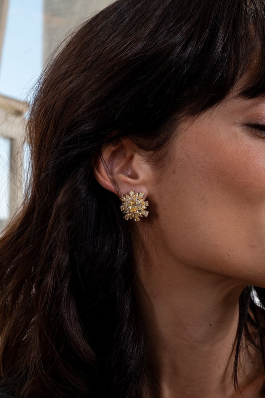 Brinco Botão Flor Pedraria Yellow Fancy Ródio Branco