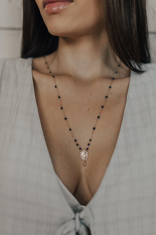 Colar Escapulário Pedras Naturais Nossa Senhora Aparecida Dourado