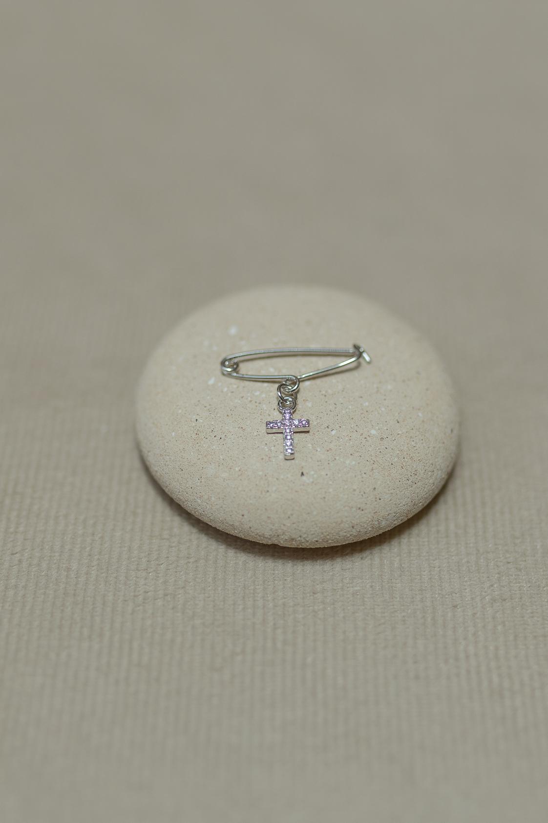 Lindo alfinete com pingente de cruz cravejada, perfeito para você presentear no banho de ródio branco.