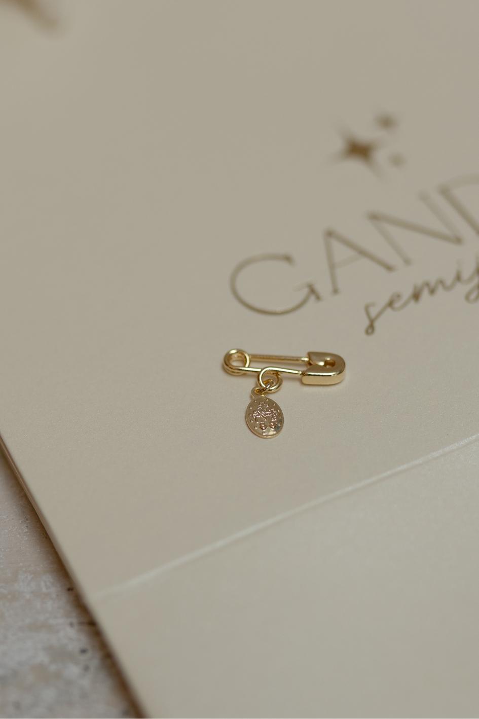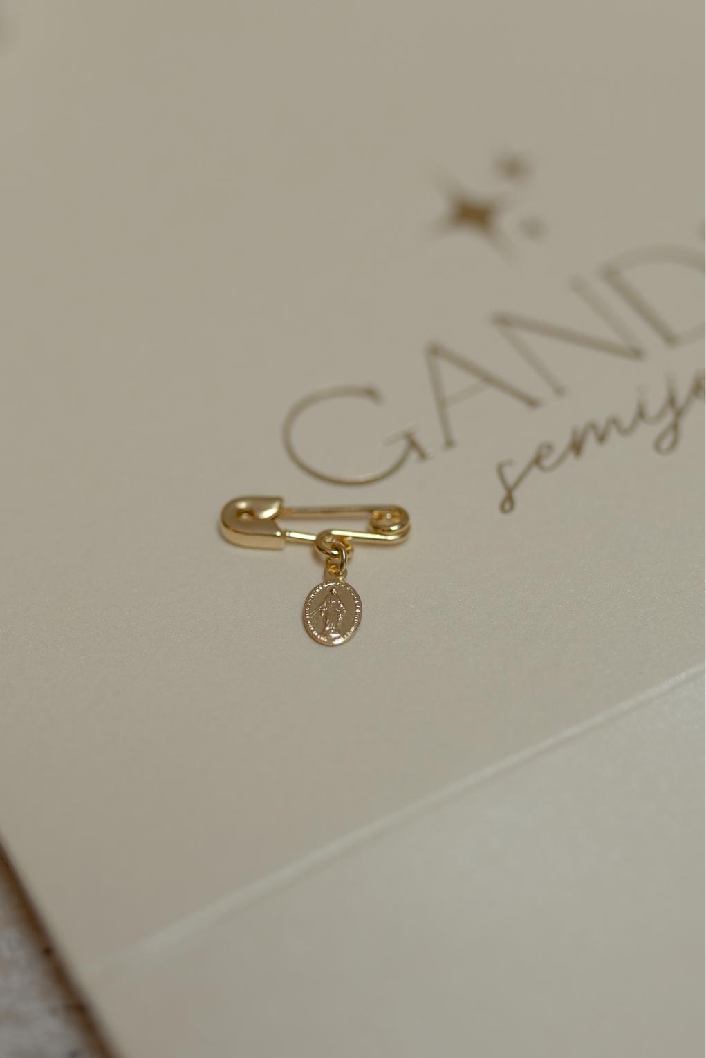 Lindo alfinete com pingente de Nossa Senhora das Graças com a medalha milagrosa, perfeito para você presentear no banho de ouro 18k.