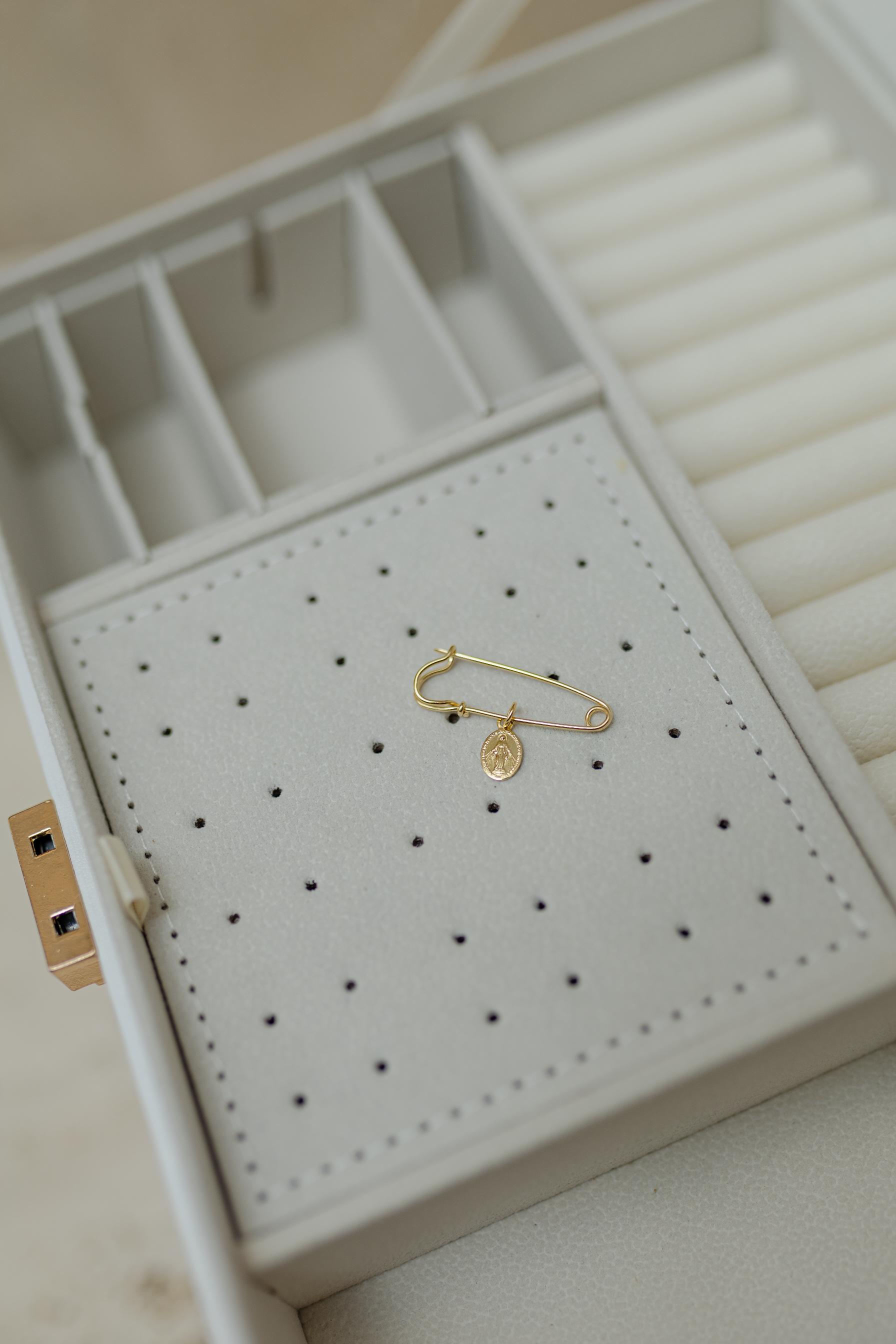 Alfinete na prata 925 com pingente de Nossa Senhora das Graças com Medalha Milagrosa atrás na semijoia, perfeito para você presentear no banho de ouro de 18k.