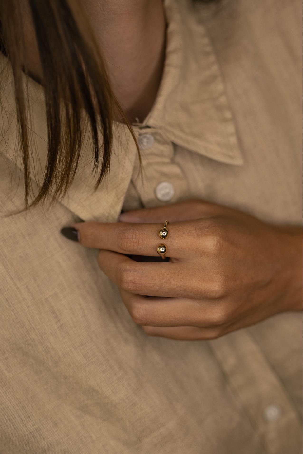 Anel ajustável minimalista composto por 2 esferas no banho de ouro 18k.