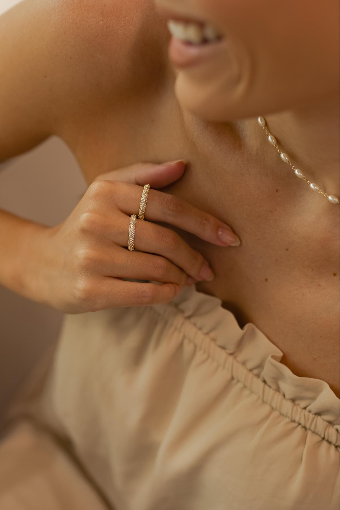 Anel aliança com 3 fileiras cravejadas com zircônias cristal no banho de ouro 18k