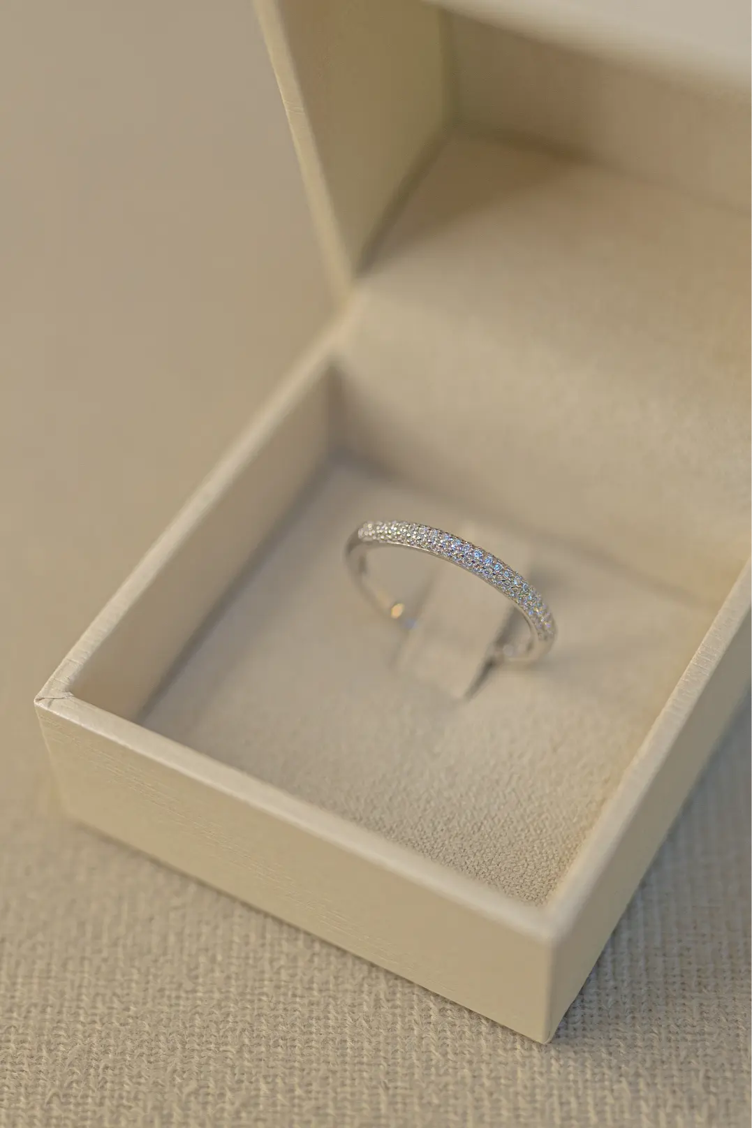 Anel aparador em prata 925 com banho de ródio, com zircônias que oferecem brilho e sofisticação. Peça delicada e versátil, ideal para complementar outros anéis ou usar sozinho em diferentes ocasiões.