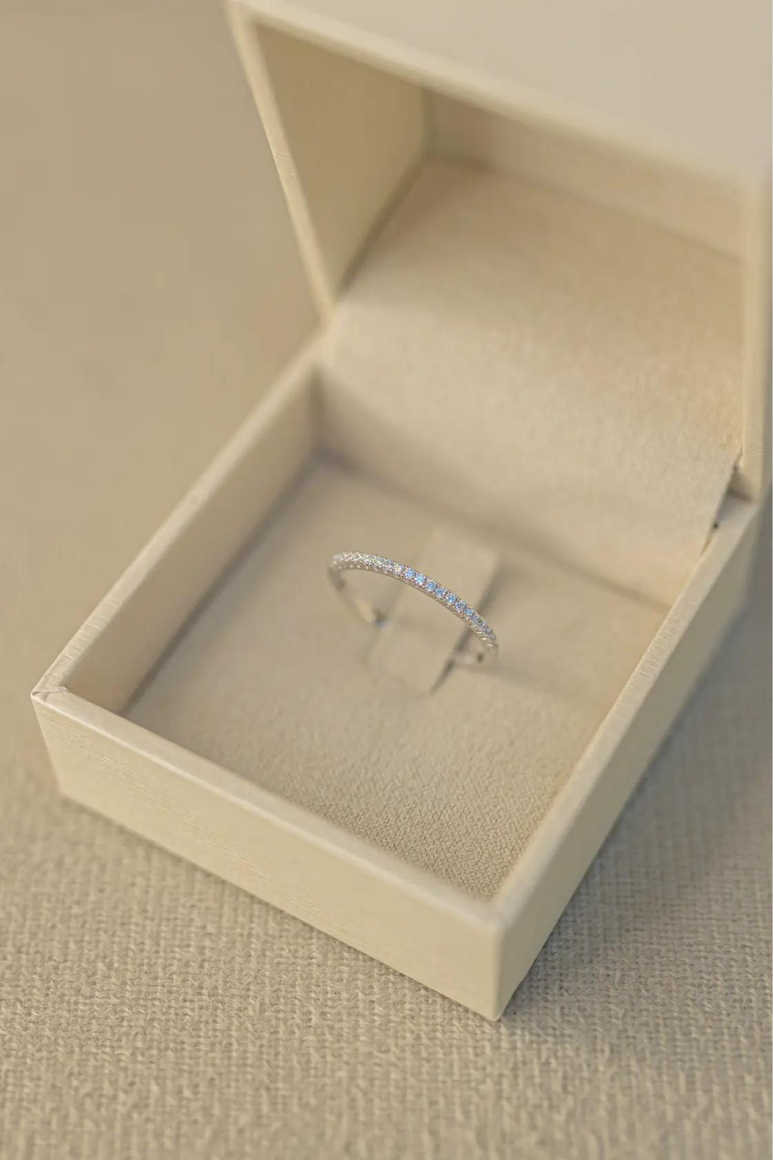 Anel fino meia aliança cravação cristal na prata 925 e banho de ródio branco.