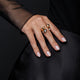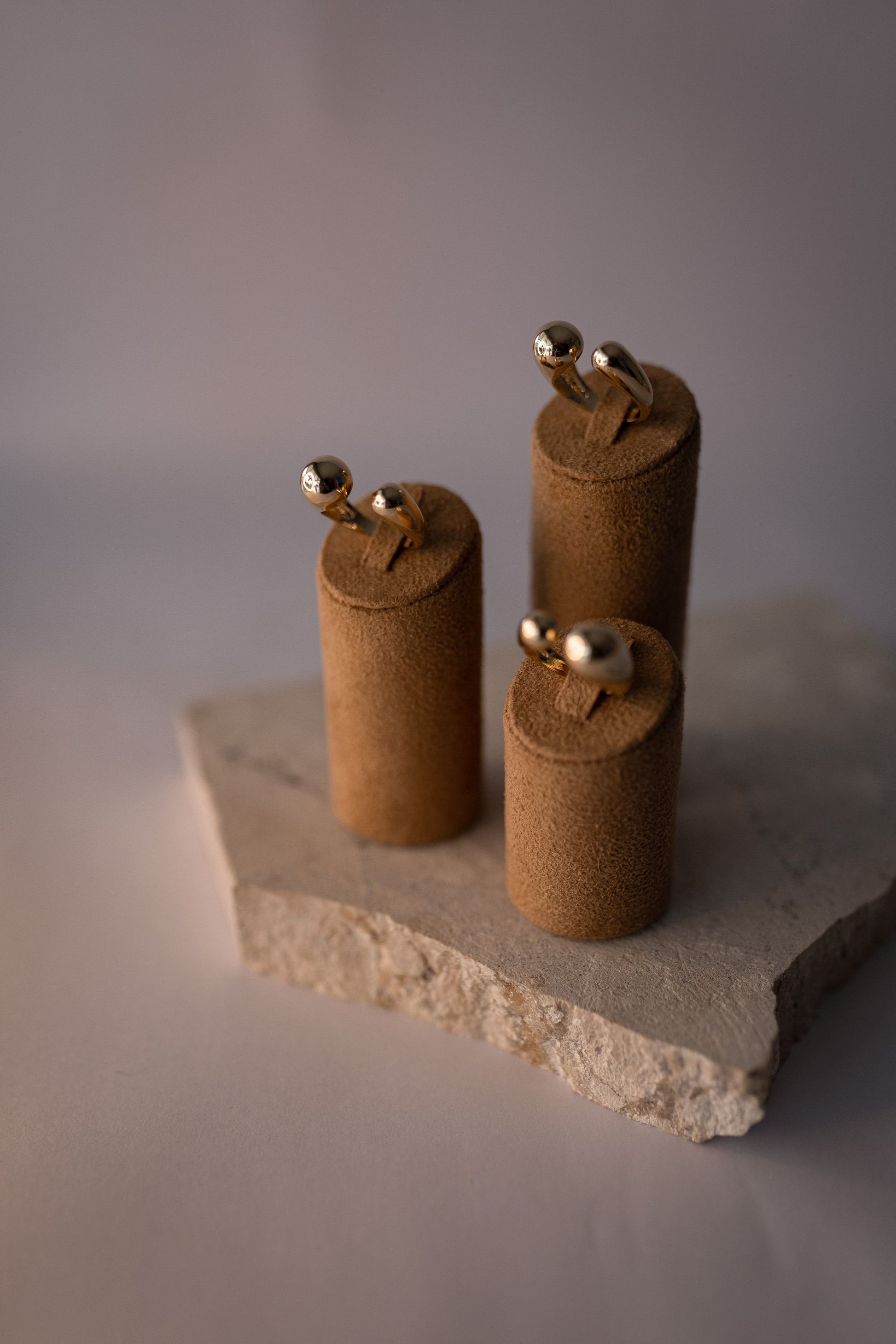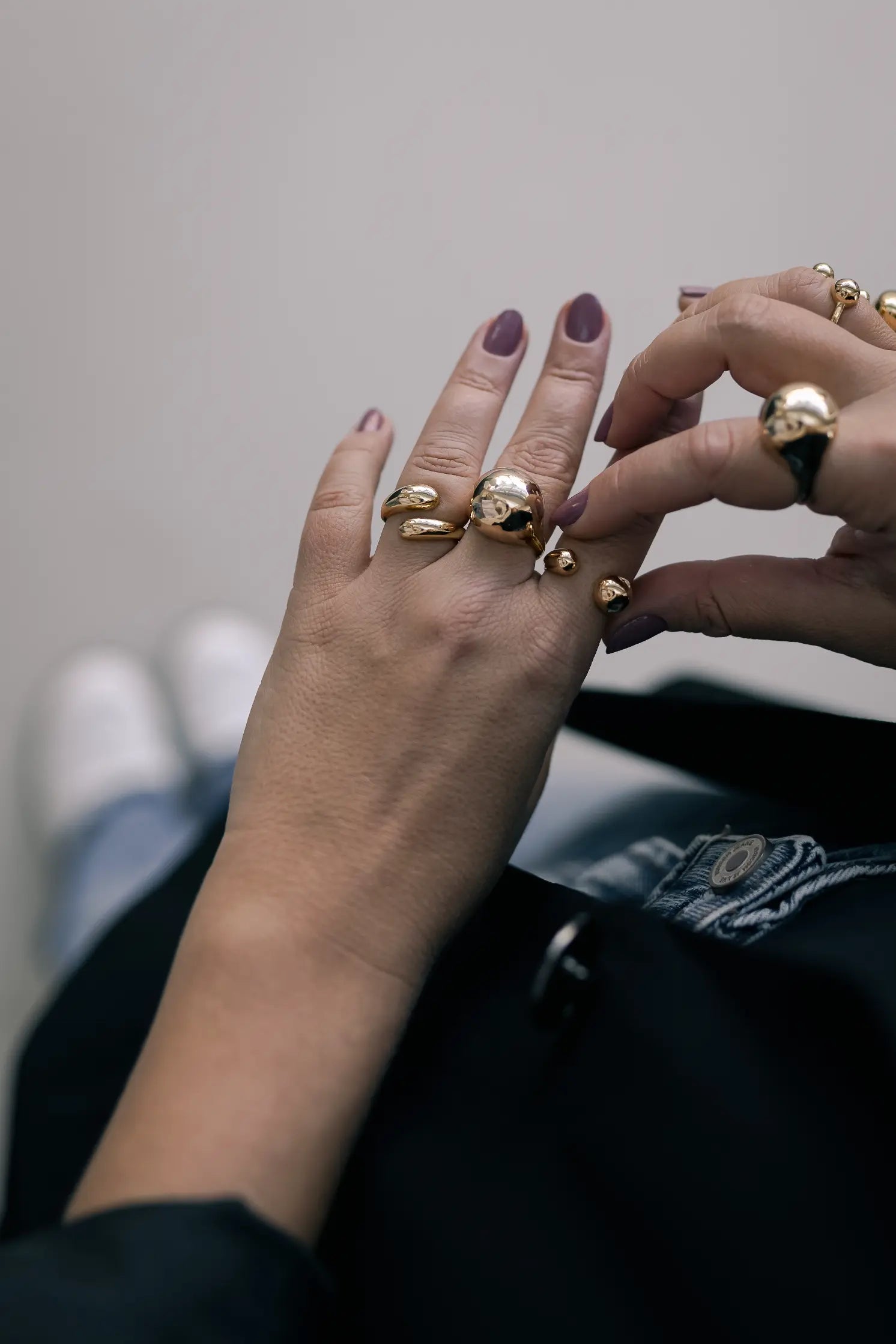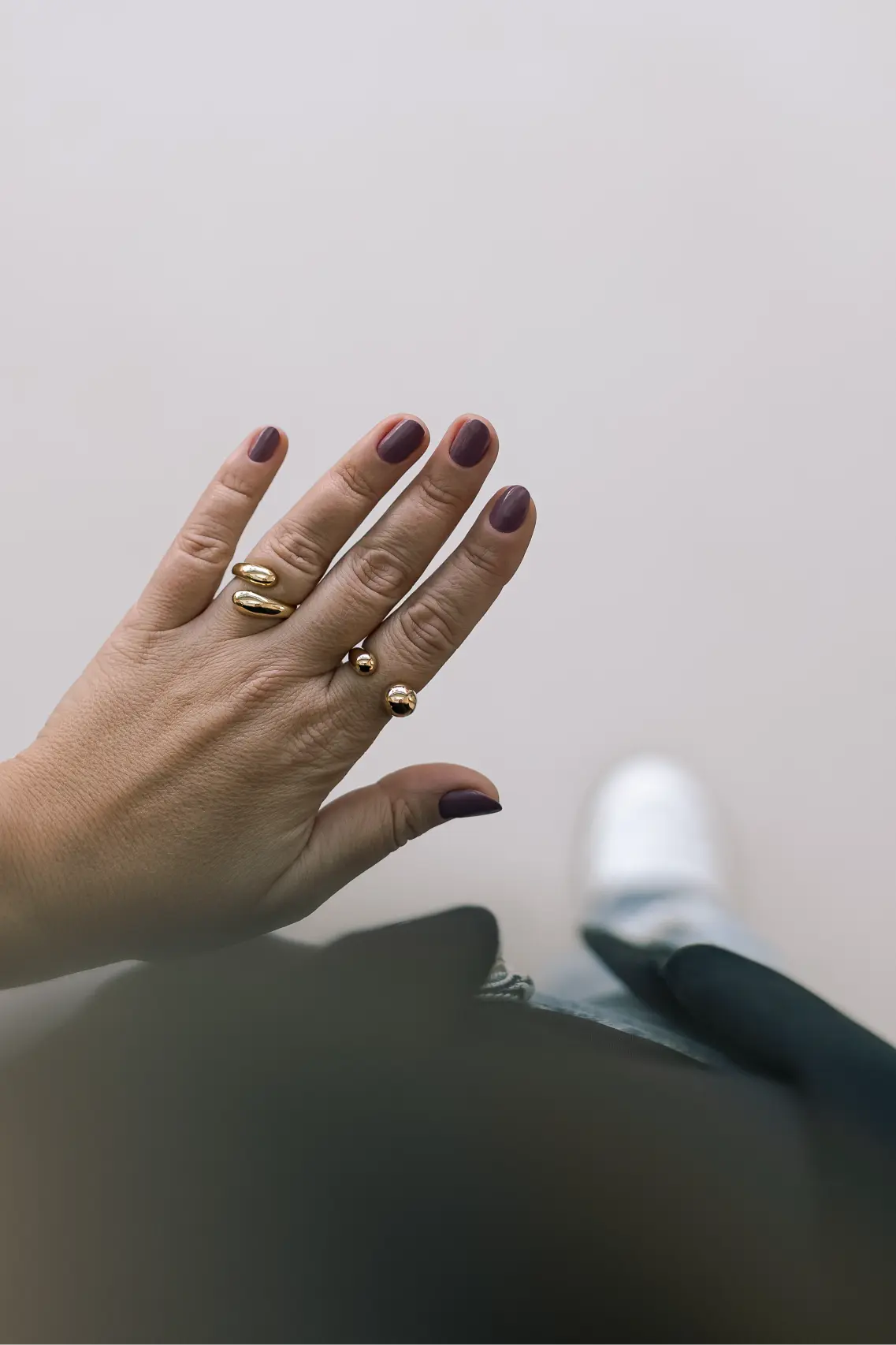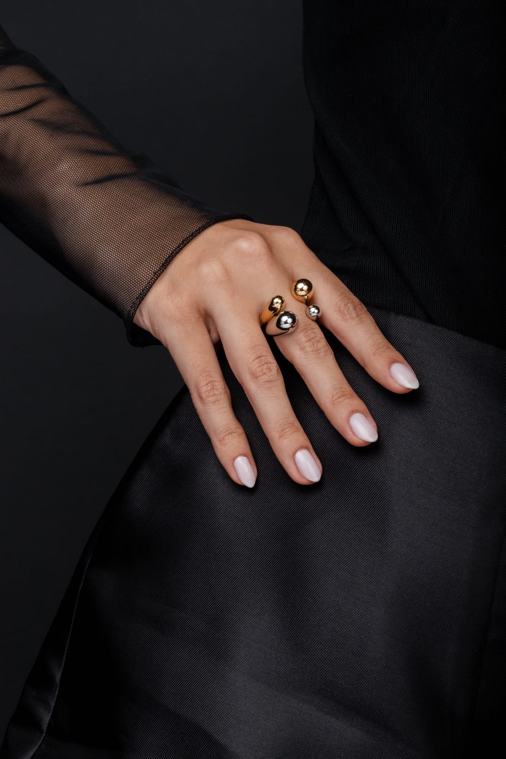 Anel liso com design entreaberto e detalhe com duas esferas. Disponível no banho de ouro 18K.