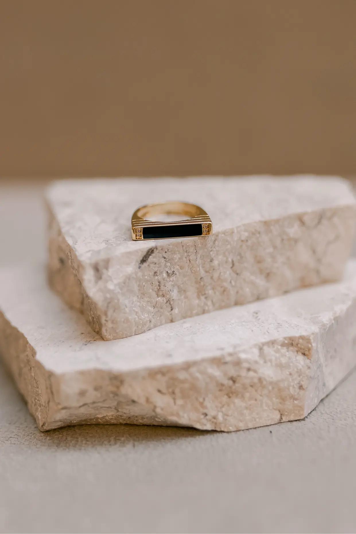 Anel no formato quadrado, esmaltado na cor preto no banho de ouro 18K.