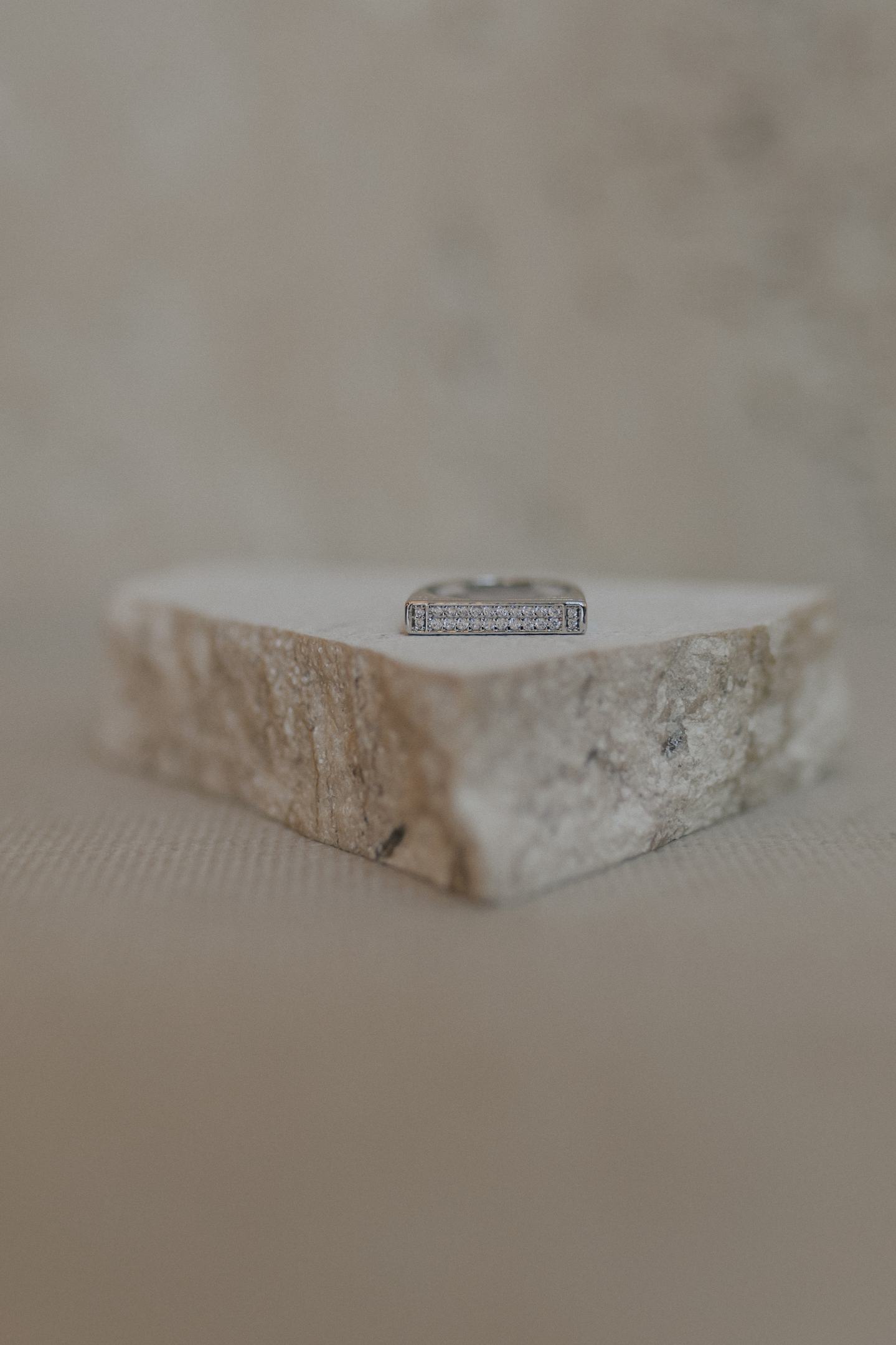 Anel com frente reta e cravação de micro zircônias cristal no banho de ródio branco.