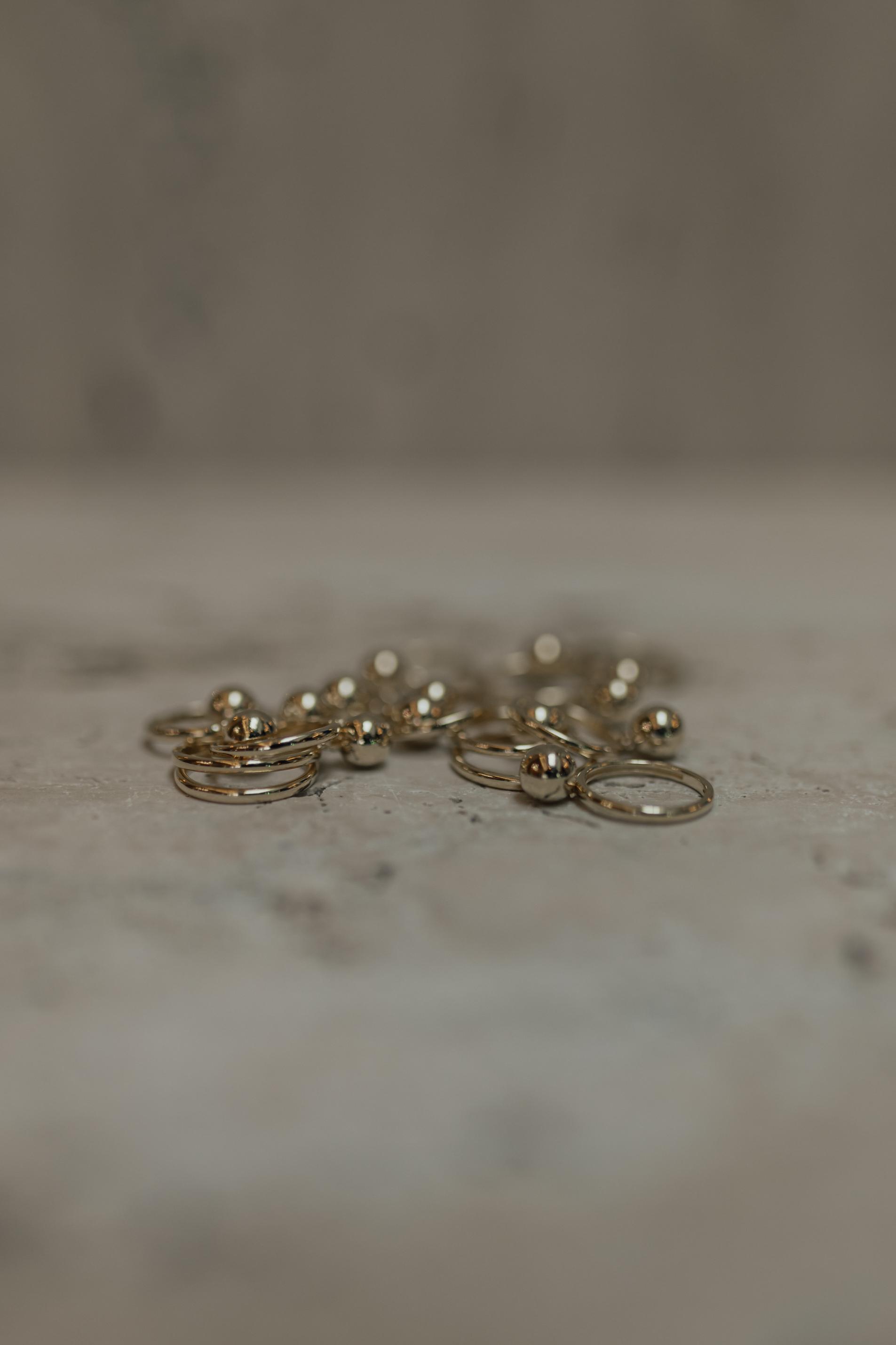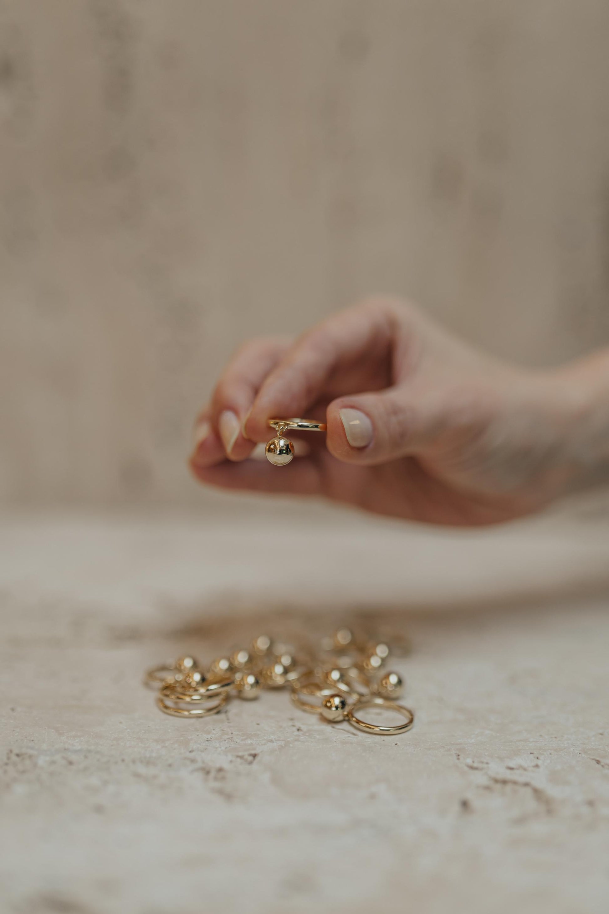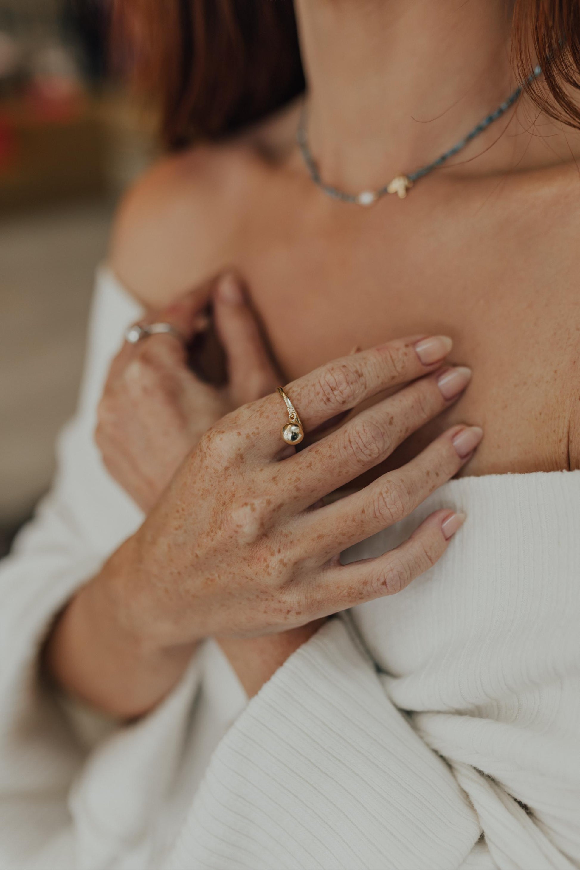 Anel com pingente de esfera pendurado no banho de ouro 18k.