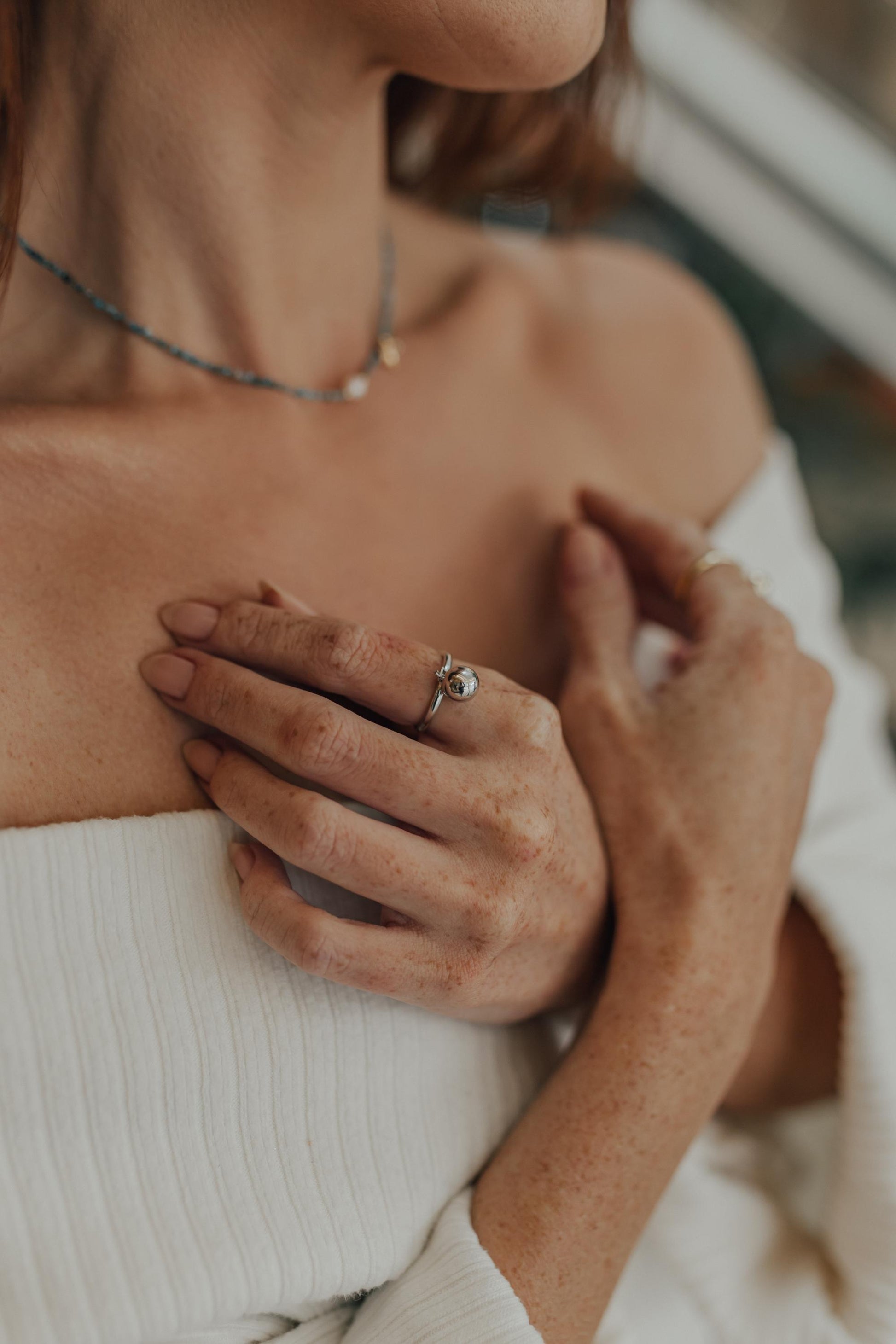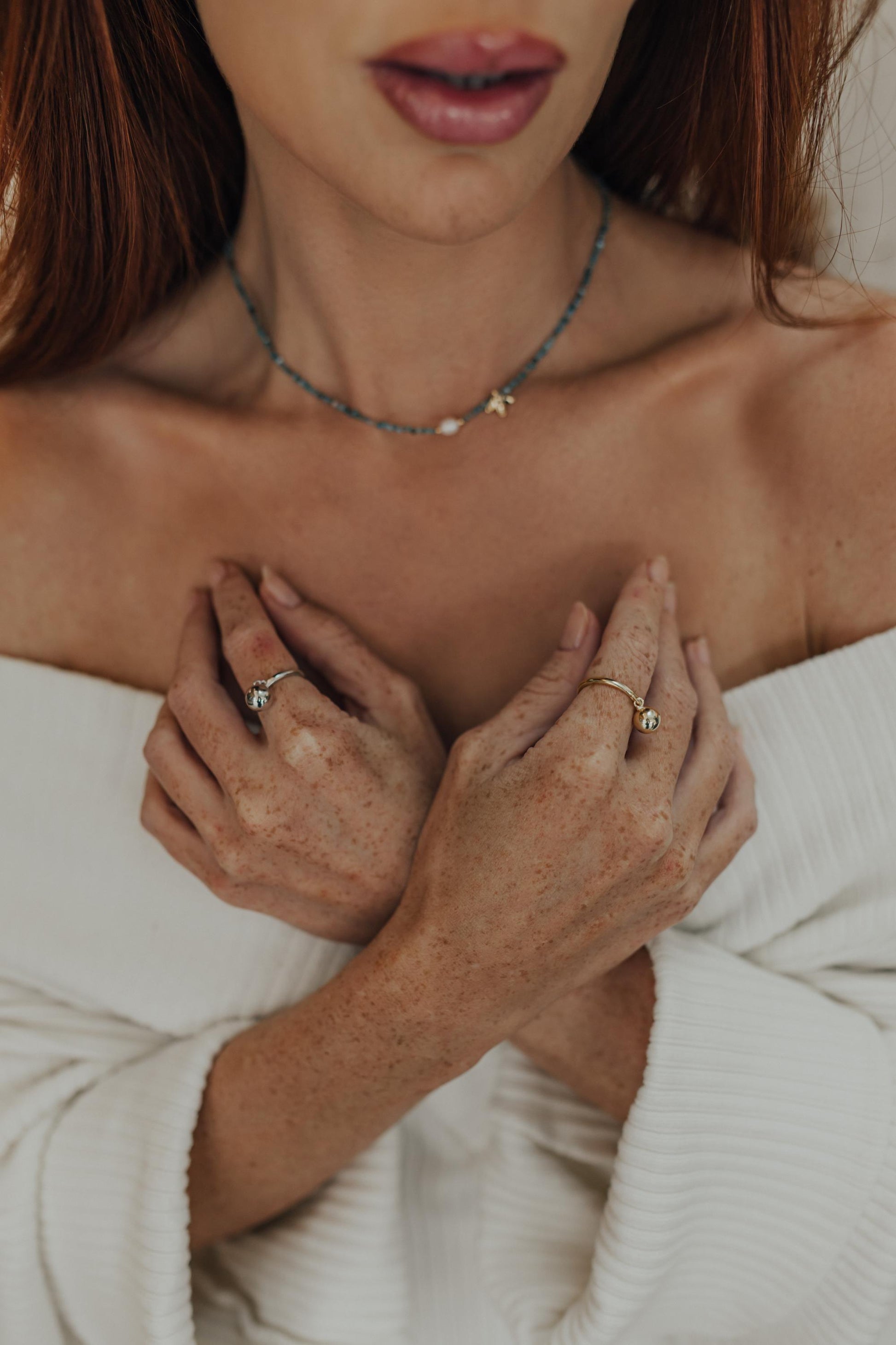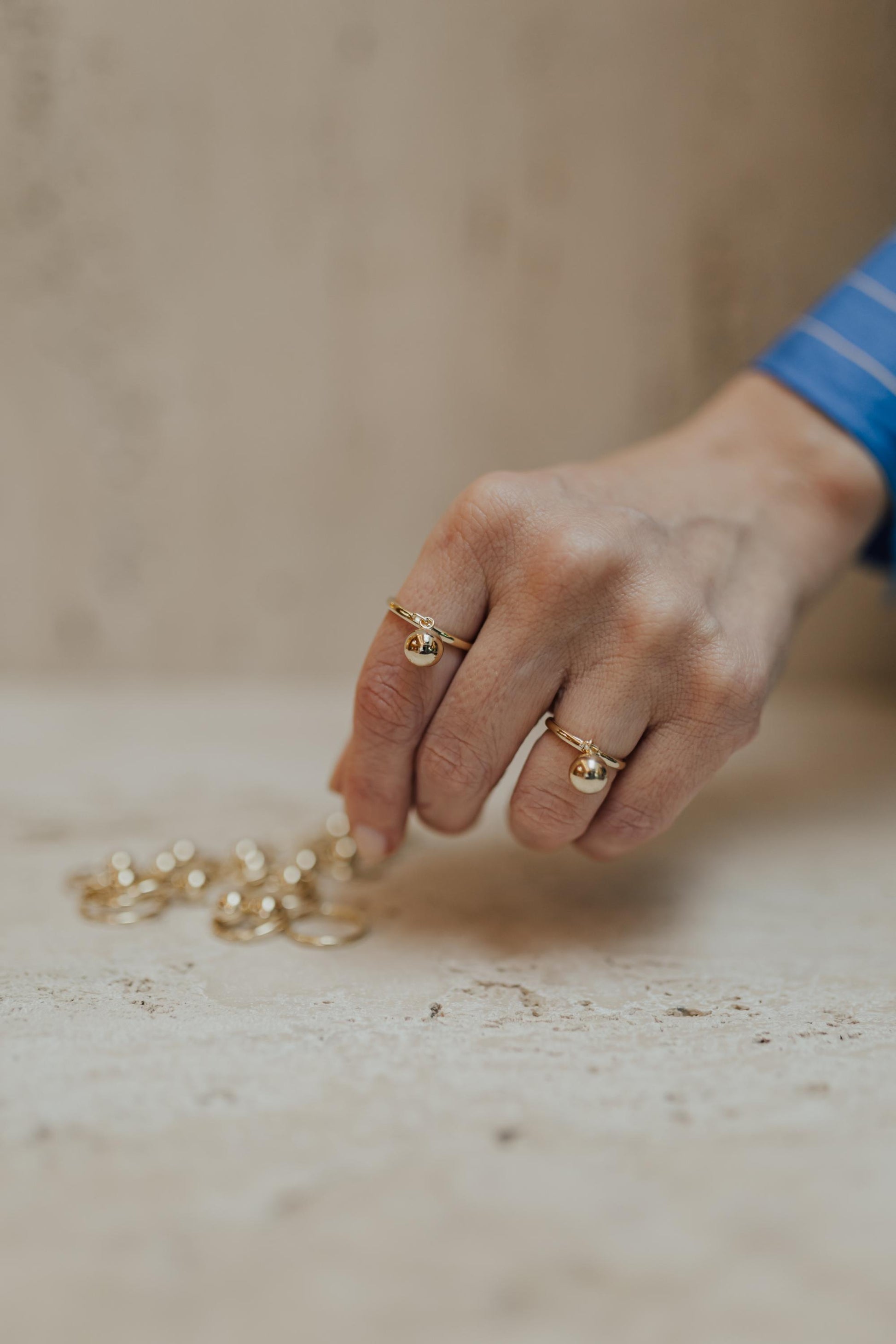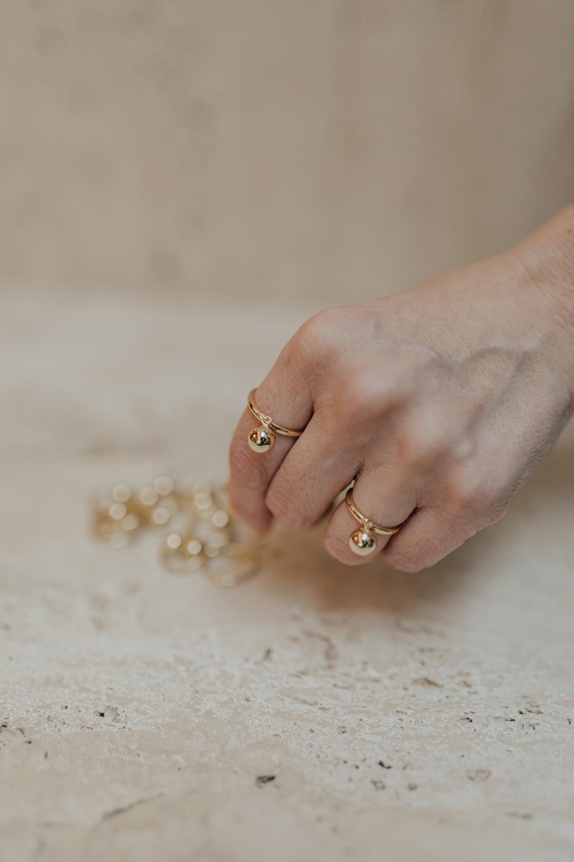 Anel com pingente de esfera pendurado no banho de ouro 18k.