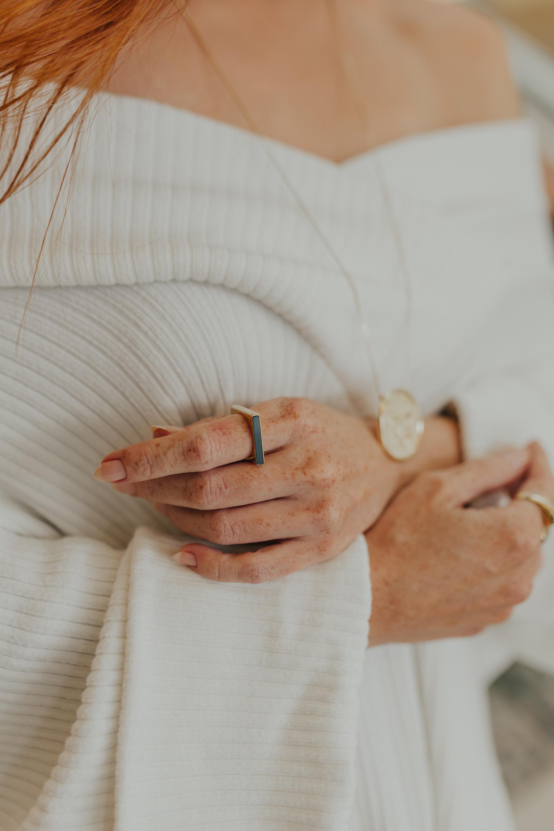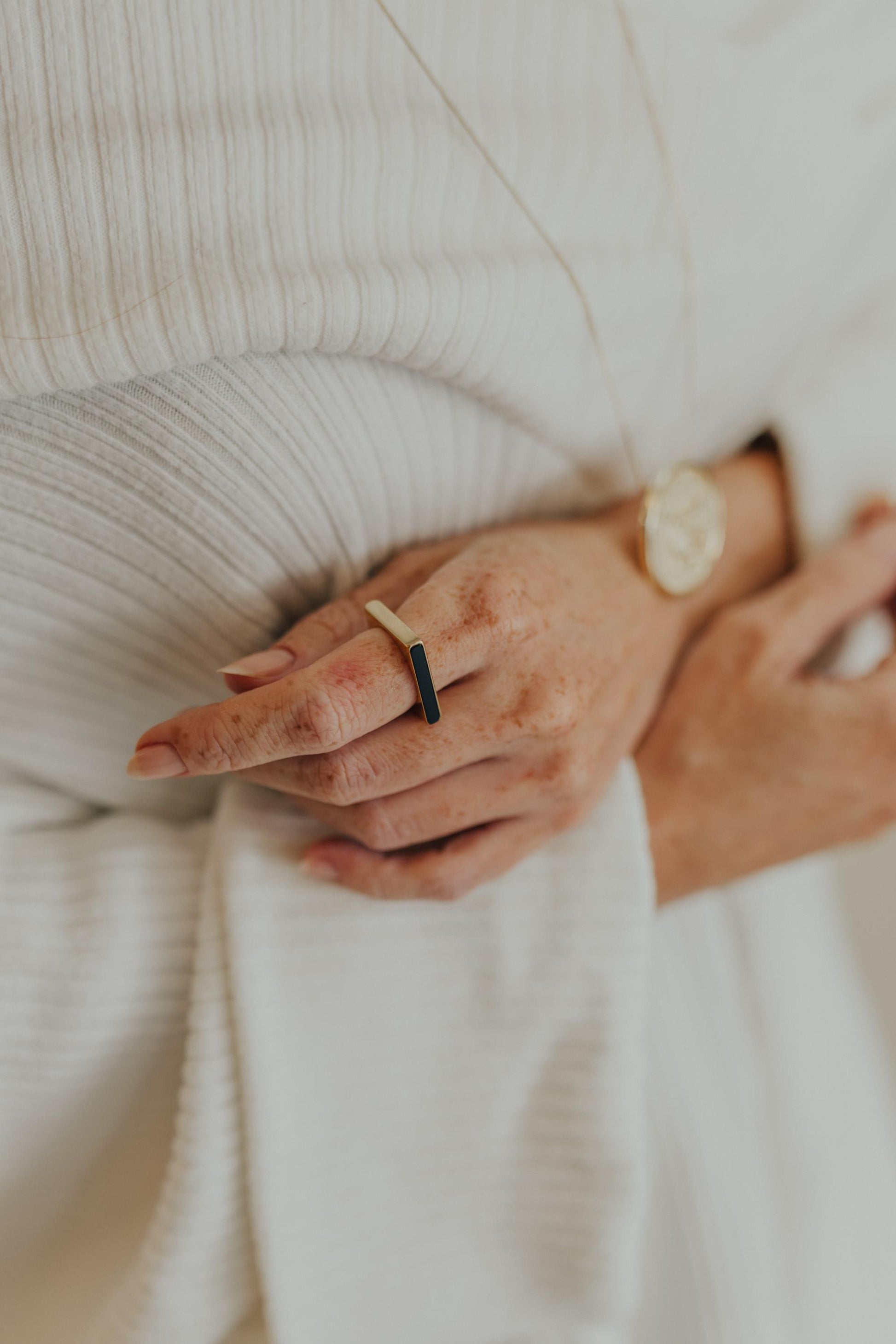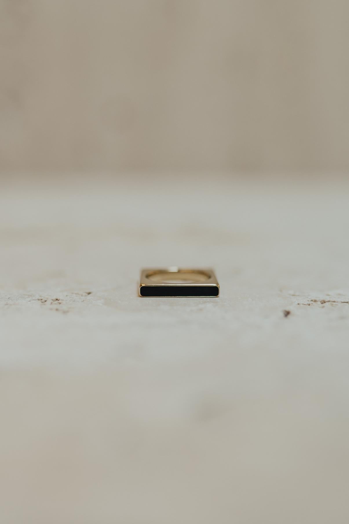 Anel no formato quadrado com detalhe esmatado preto no banho de ouro 18k.