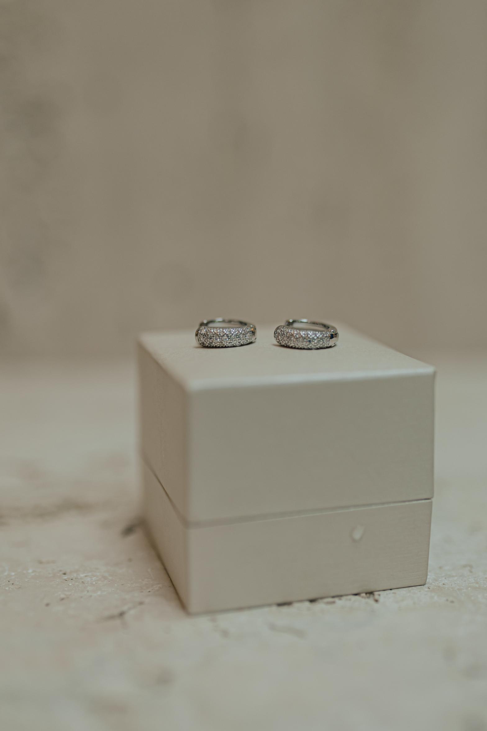 Brinco argola cravejada com zircônias na cor cristal no banho de ródio branco.