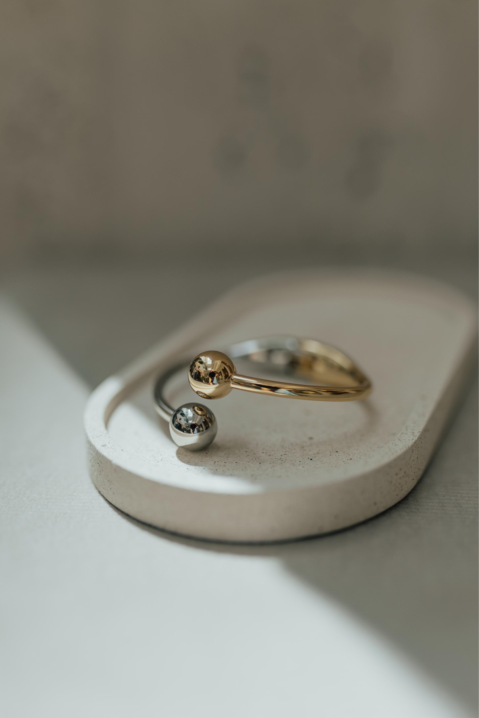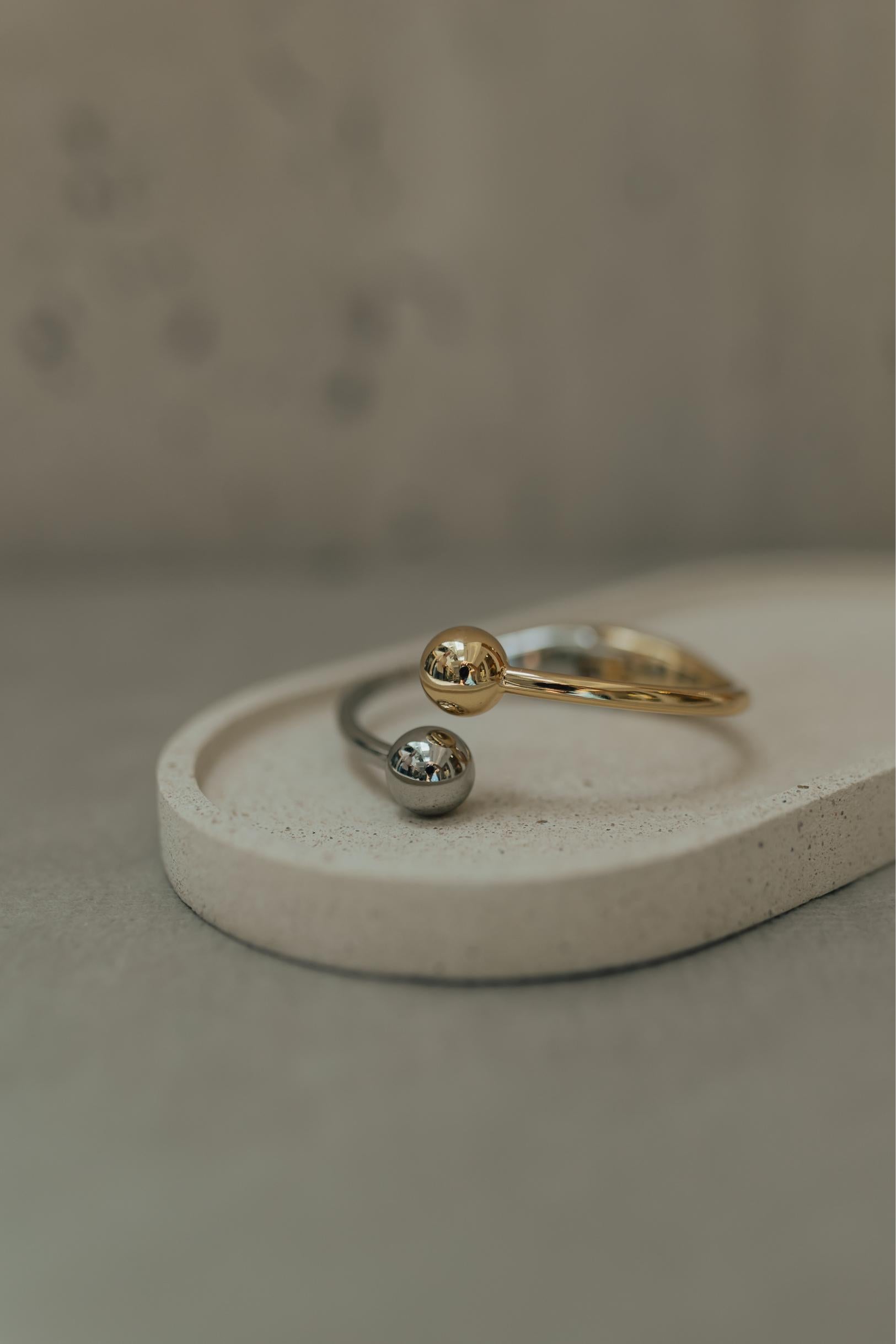 Bracelete liso duas bolas nas pontas com mix de banhos: banho de ródio branco e ouro 18k. Ele faz toda diferença no seu look.