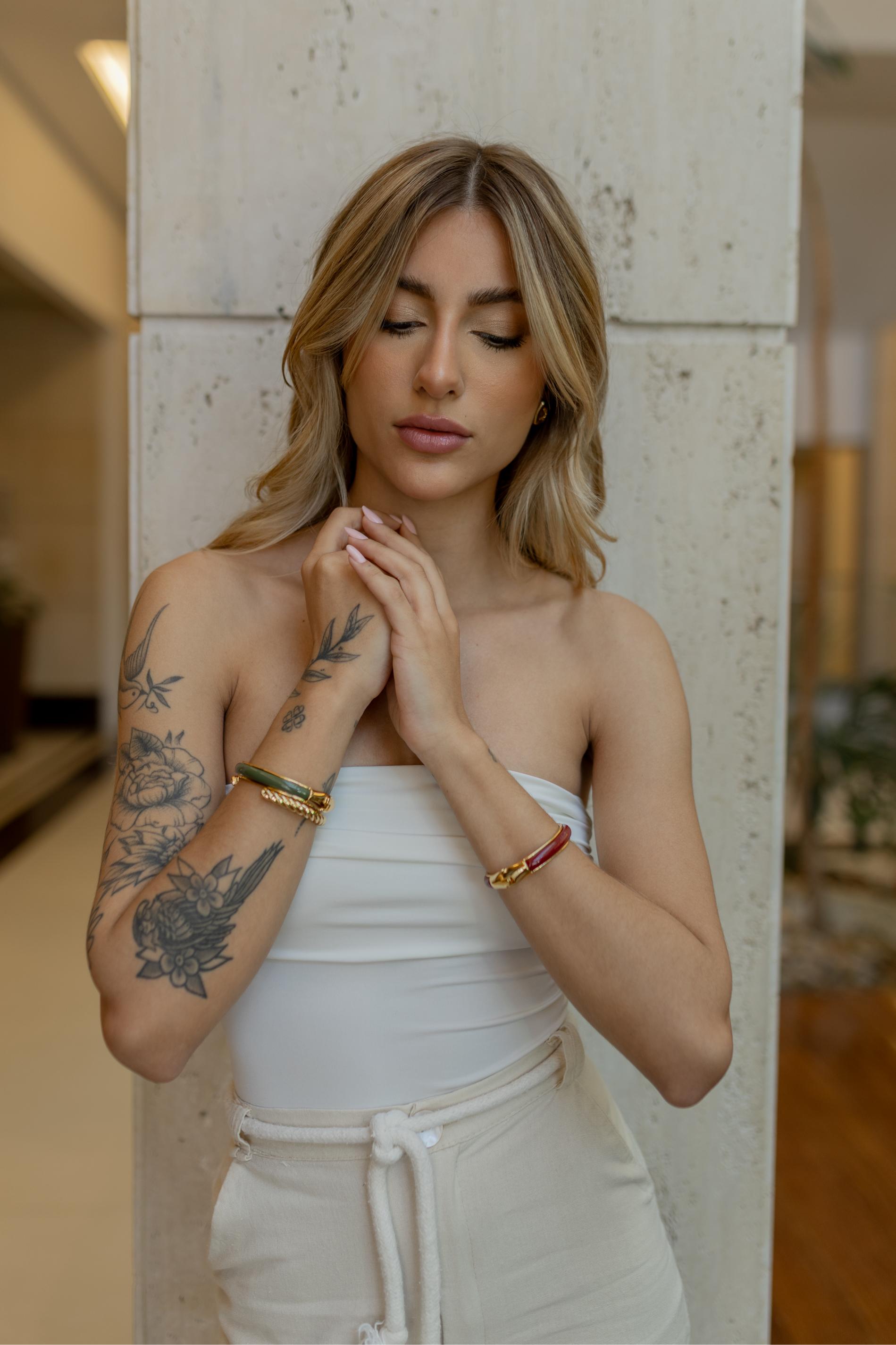 Bracelete com aplique na cor Marsala no banho de ouro 18k.