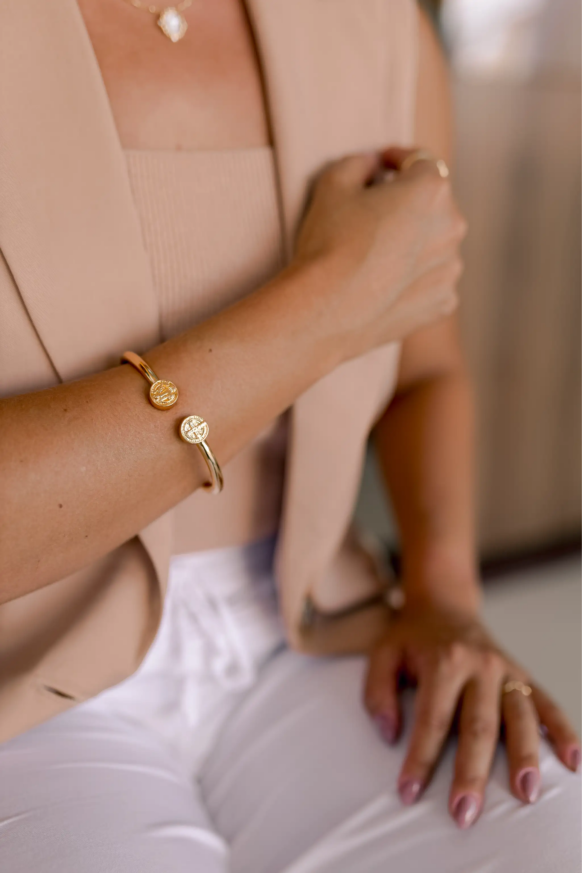 Bracelete de São Bento com abertura de mola, no banho de ouro 18k.