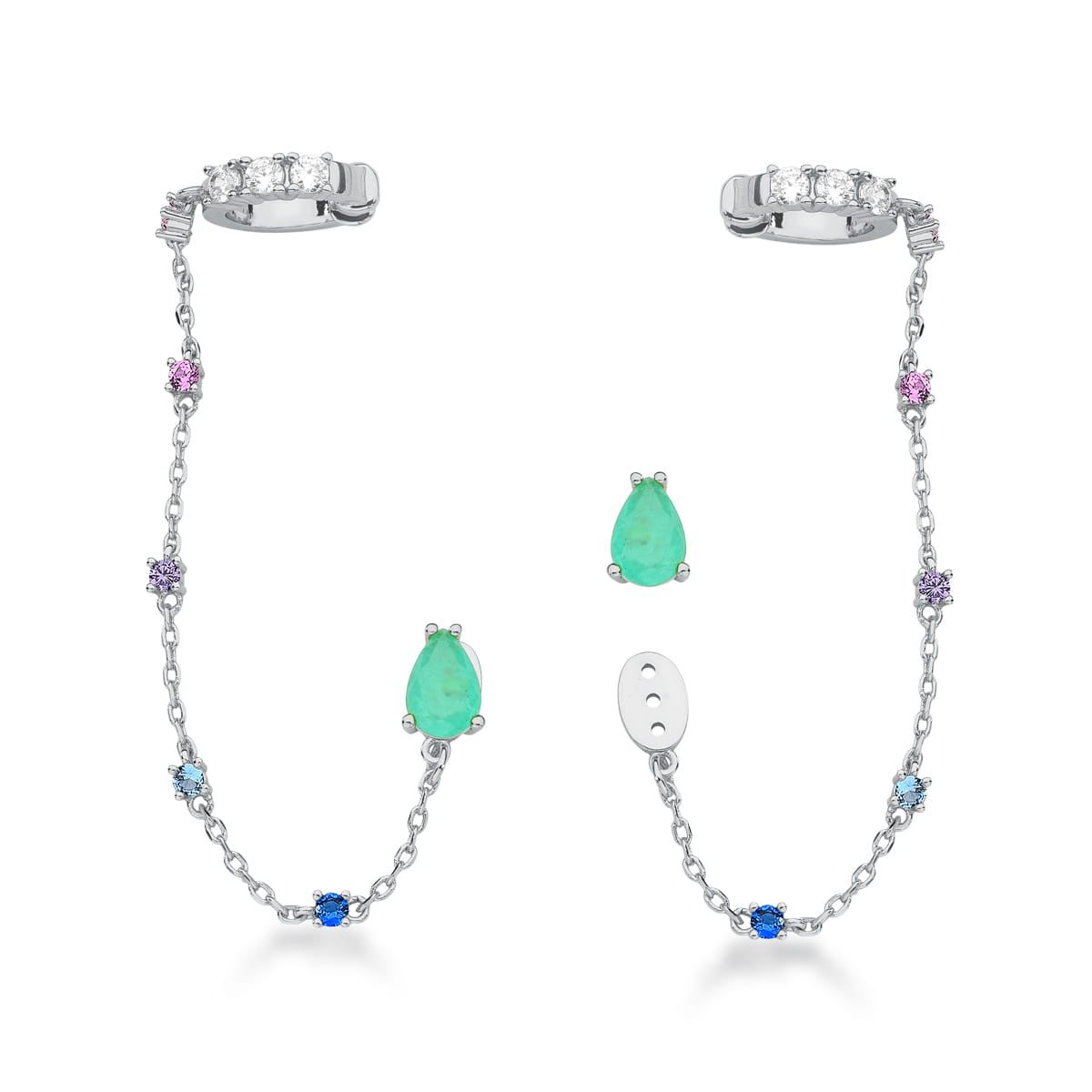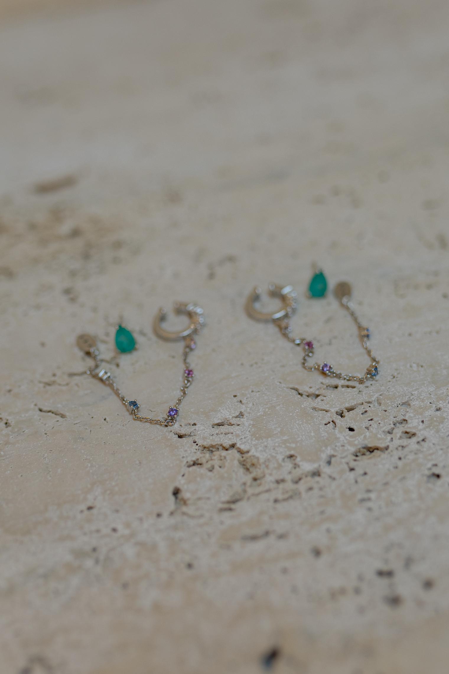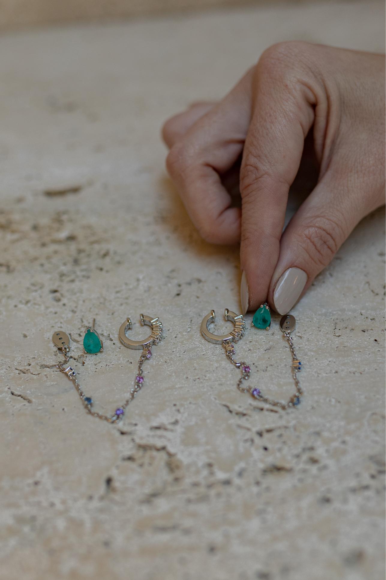 Brinco 2 em 1 Ear Bling com Gota Esmeralda Colombiana Fusion e corrente com zircônias coloridas, um brinco espetacular, lindo delicado com desing super diferente e exclusivo e a beleza desta peça é surreal, invista.