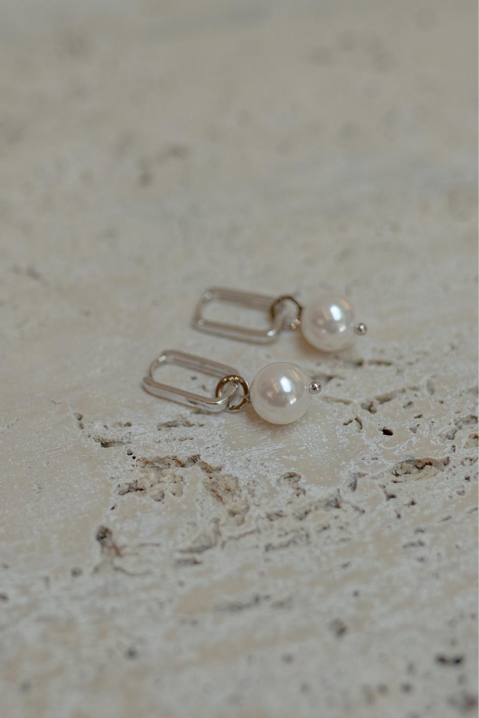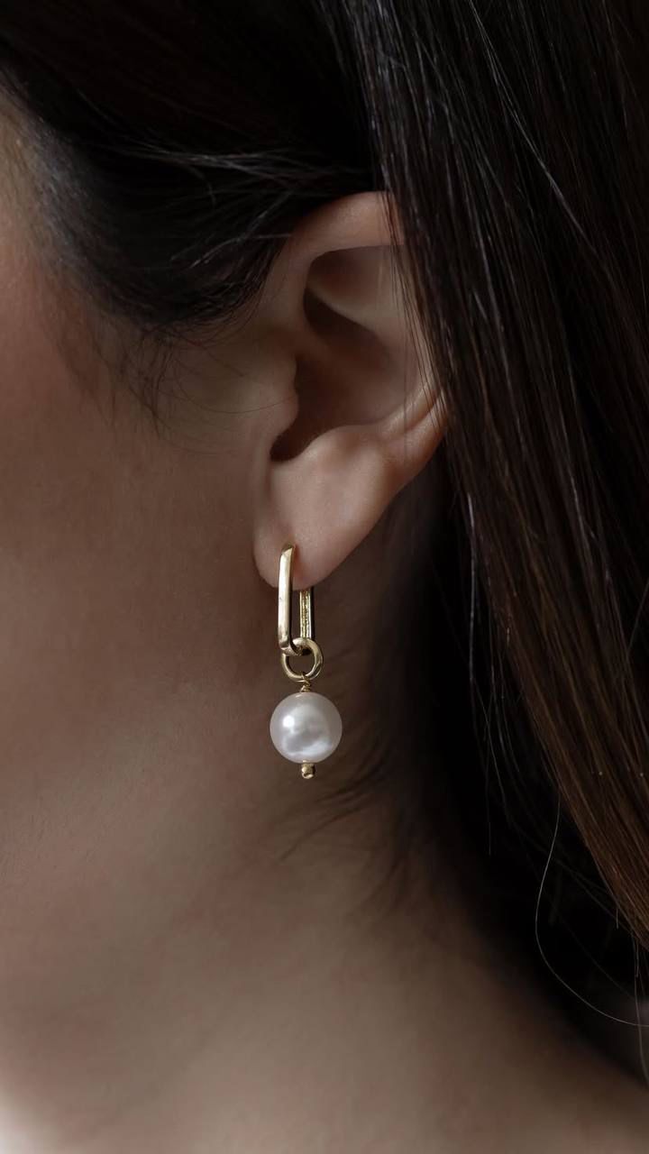 Brinco argola com fecho click e pingente de pérola de Água Doce, no banho de ródio branco.