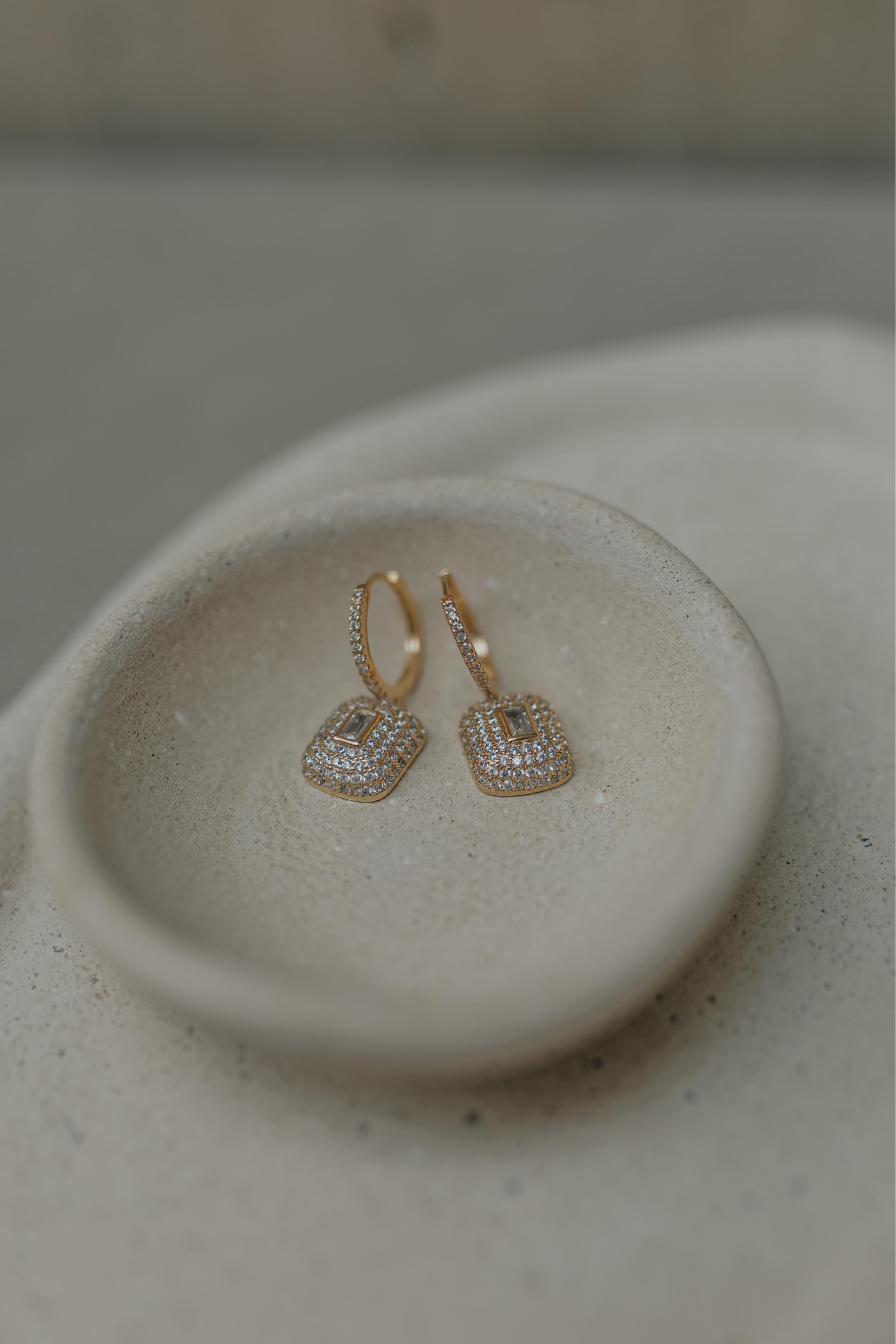 Brinco argola com pingente cravejada, zircônia central e banho de ouro.