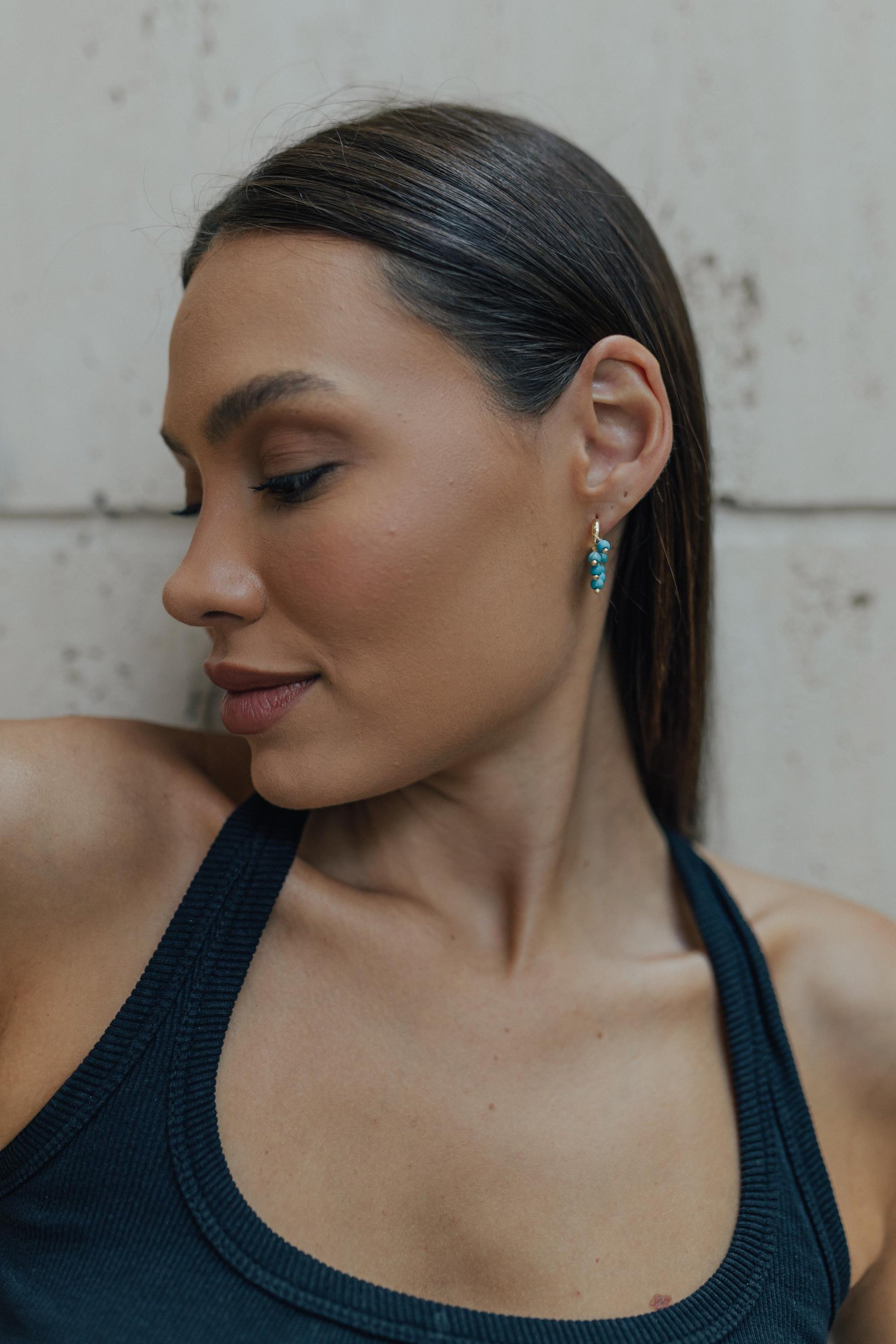 Brinco argola com pingentes de pedra natural turquesa no banho de ouro 18k.