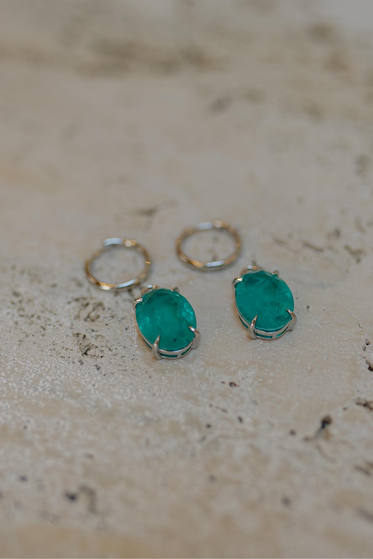 Brinco argola com pingente removível oval de esmeralda fusion no banho de ródio branco.