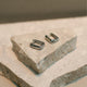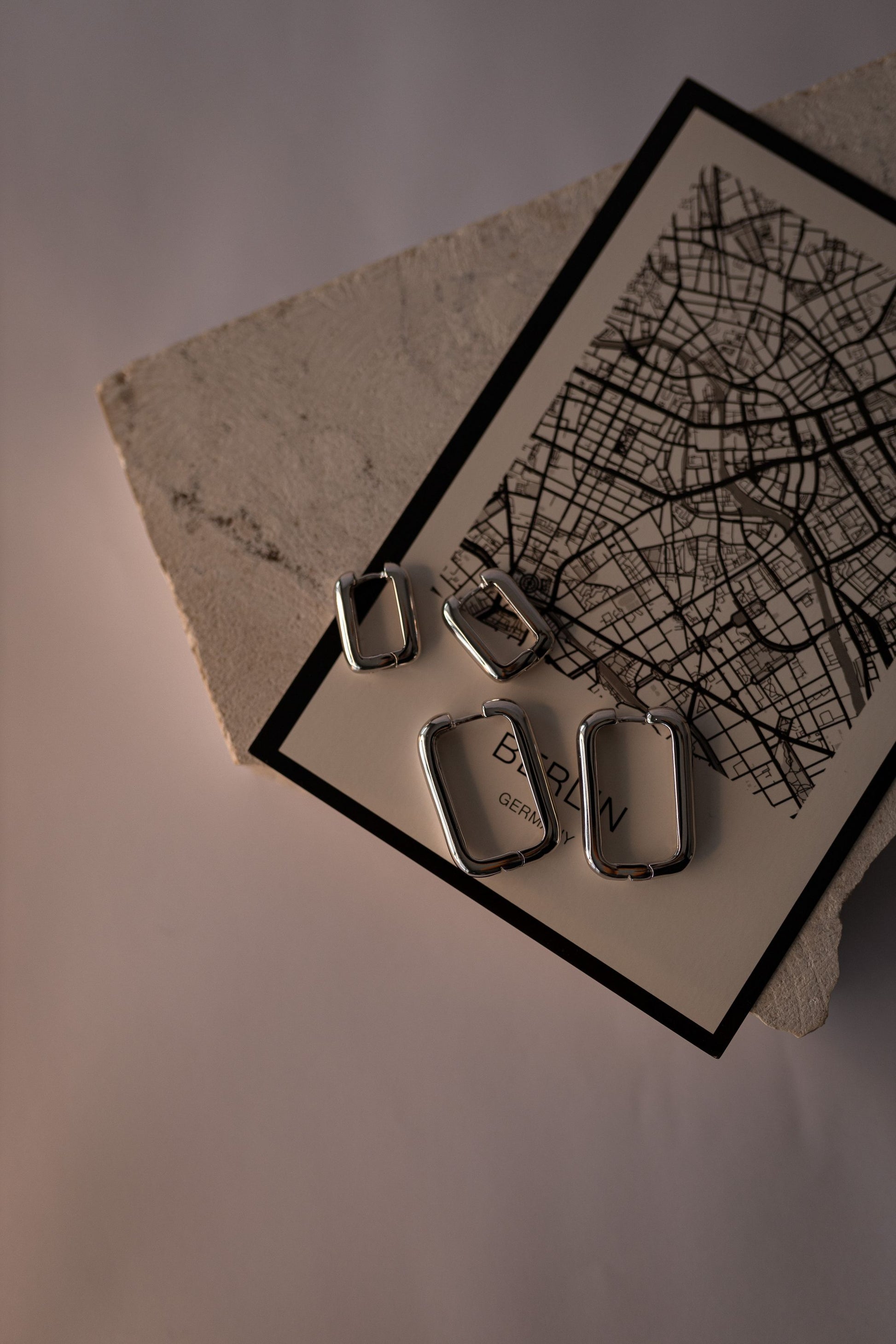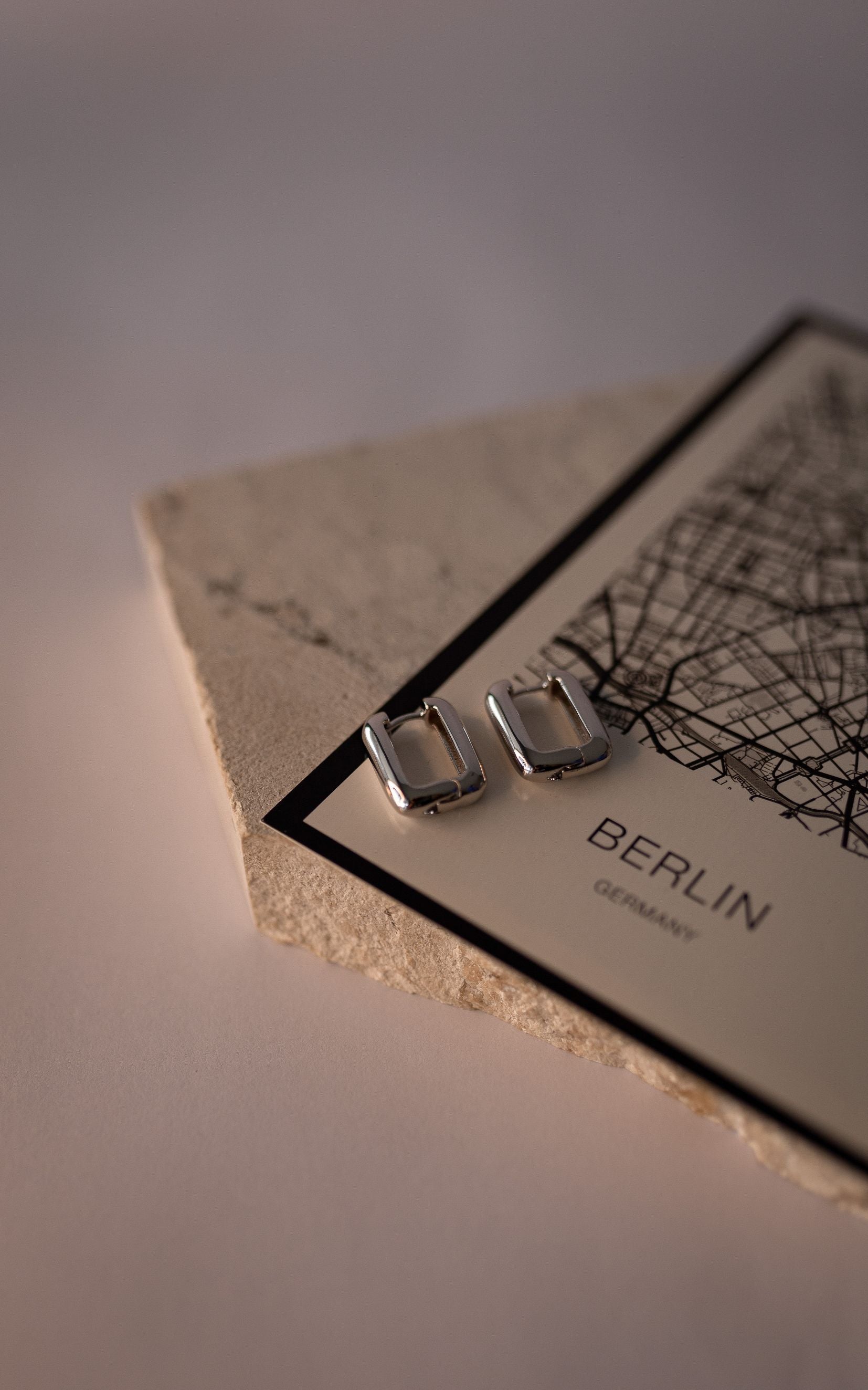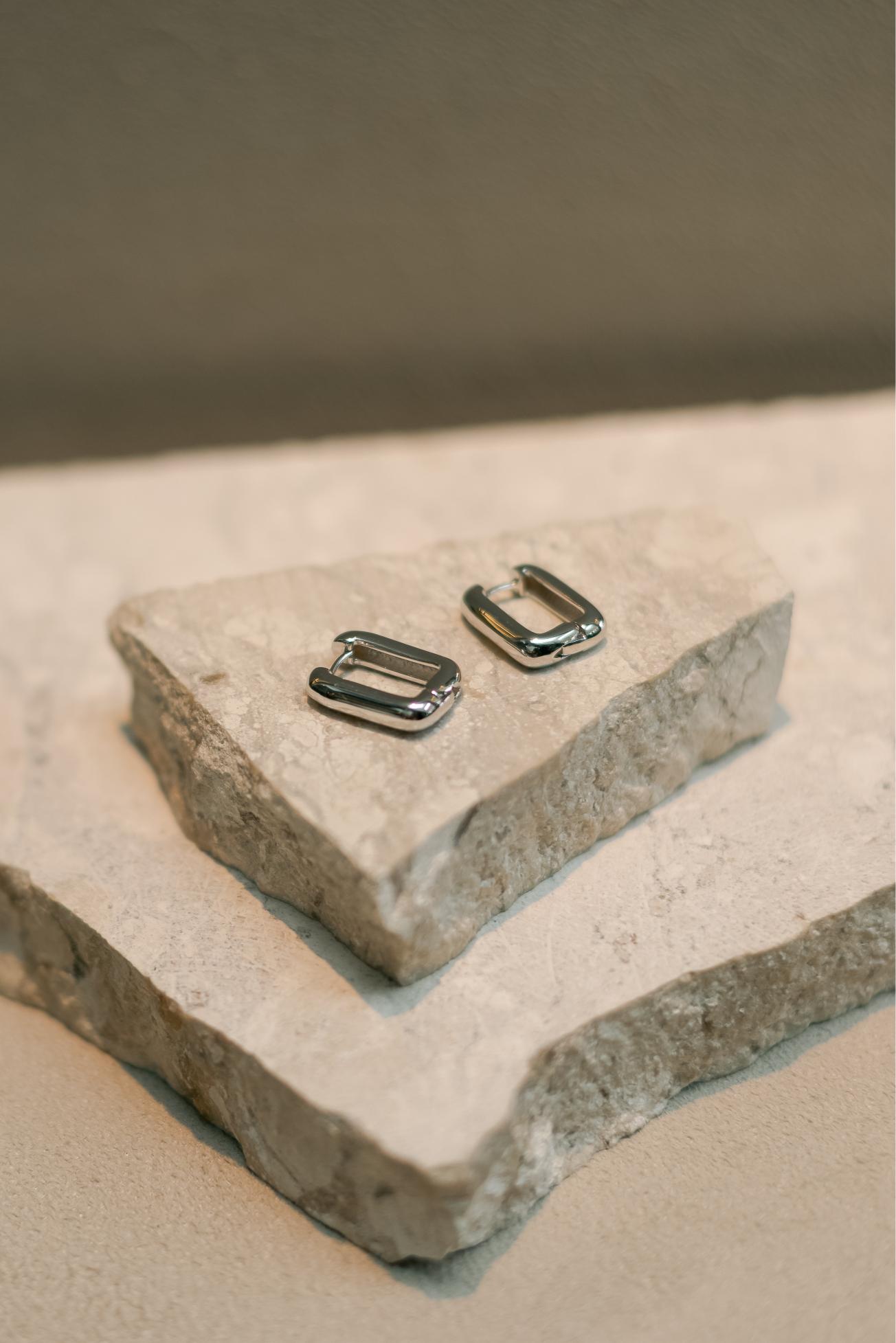 Brinco modelo argola, com design moderno e retangular, tamanho P no banho de ródio branco.