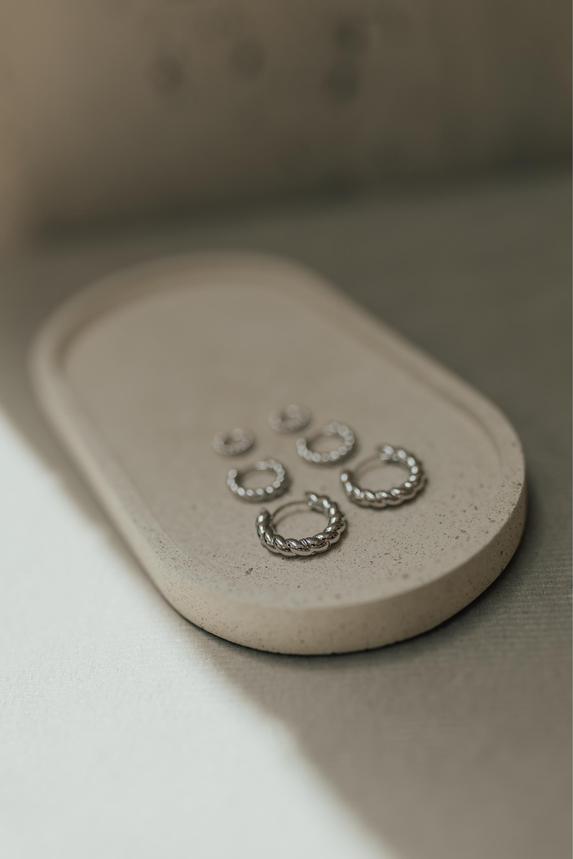 Brinco argola com abacamento liso e design torcido, banhado em ródio branco.