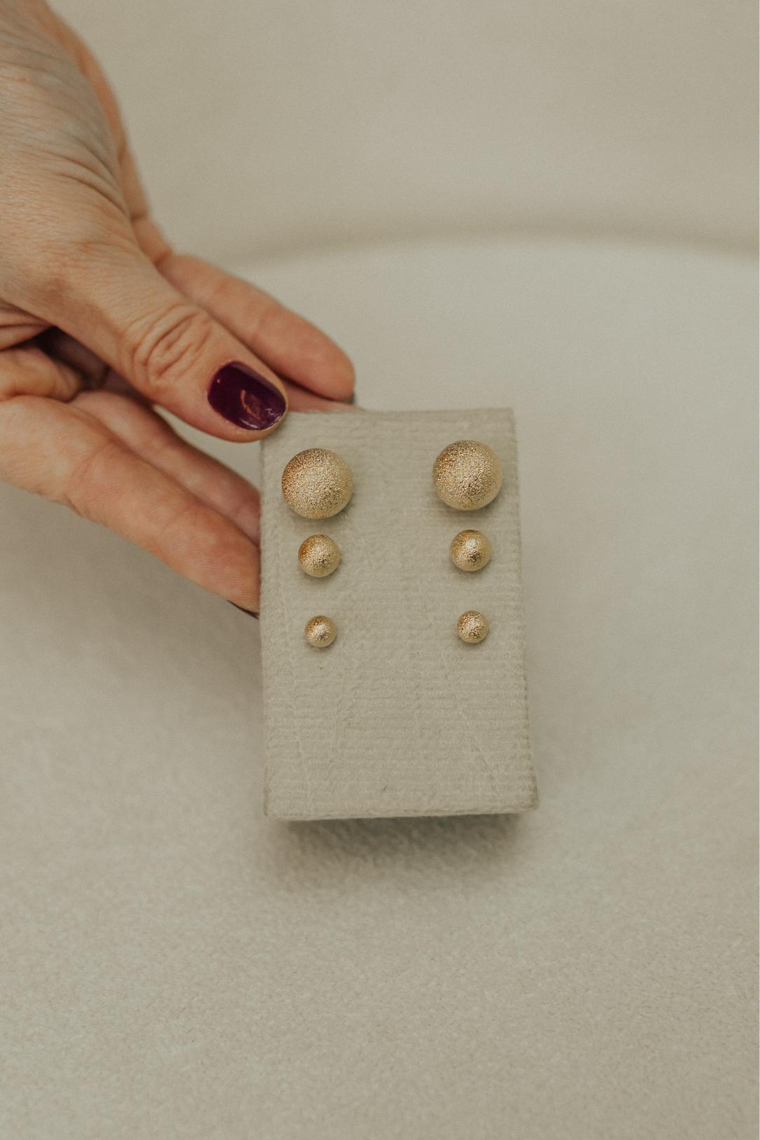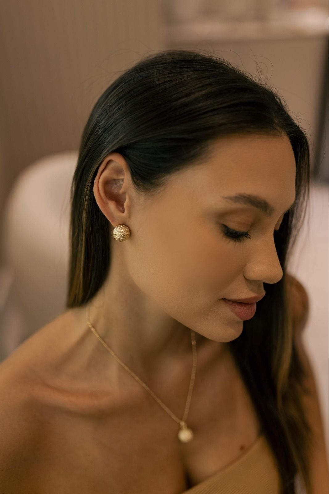 Brinco minimalista no formato de esfera fosca tamanho g no banho de ouro 18k.
