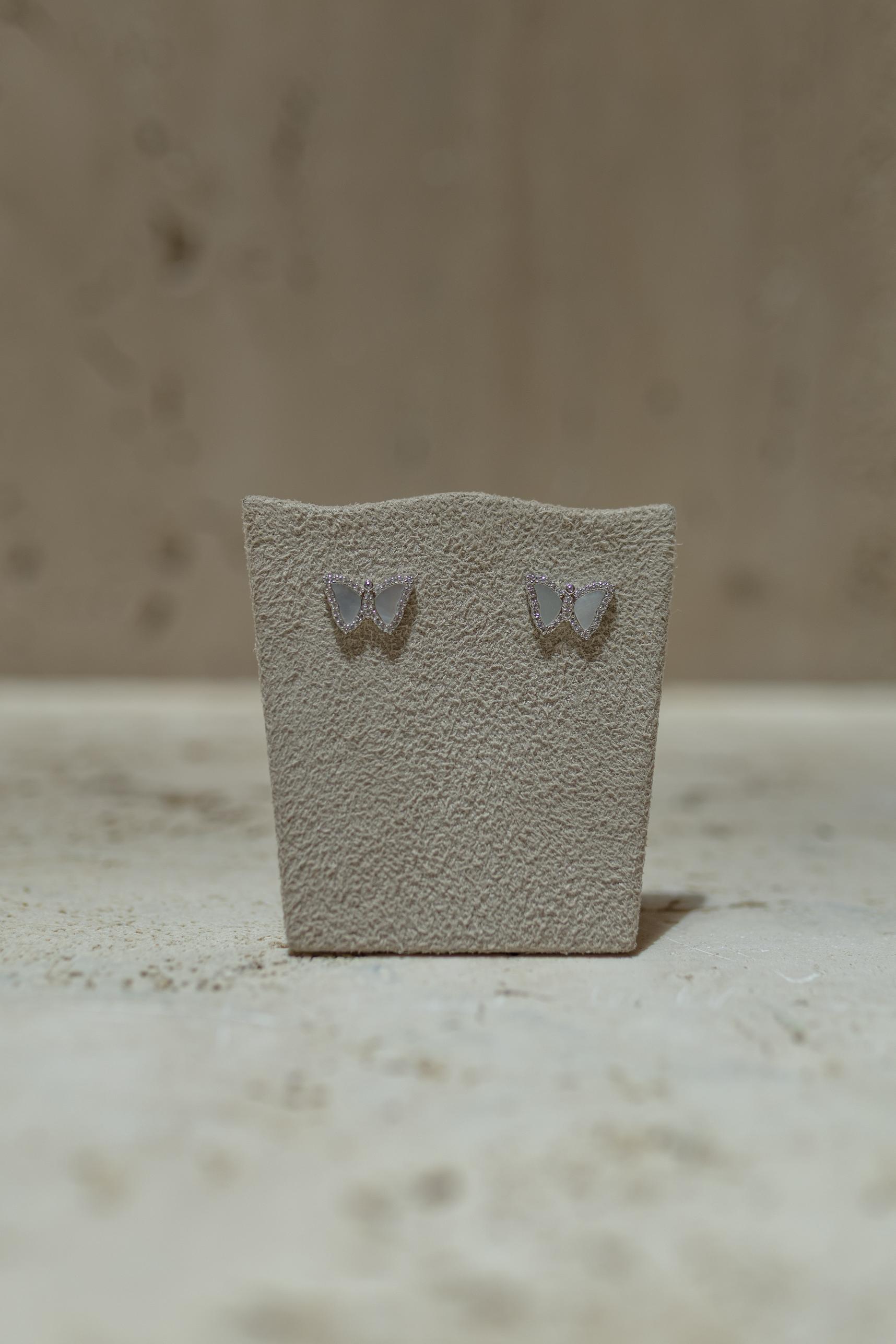 Brinco em formato de borboleta em madrepéroa com borda cravejada no banho de ródio branco.