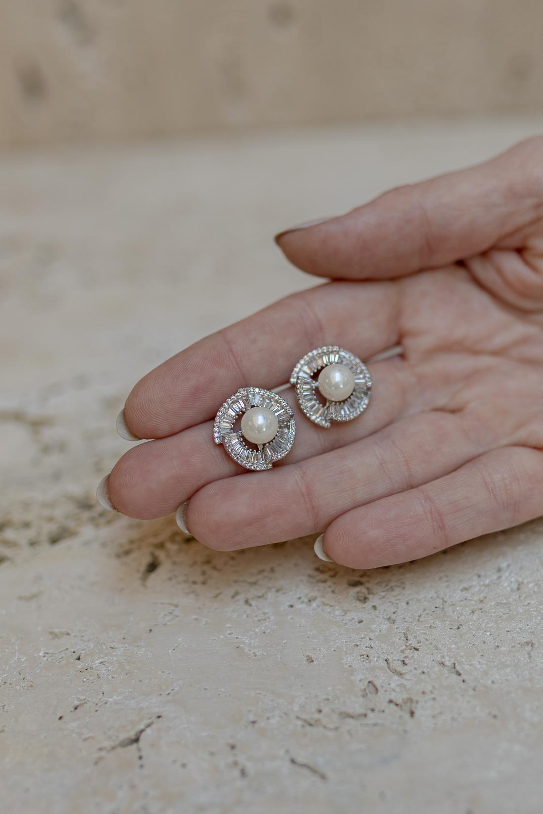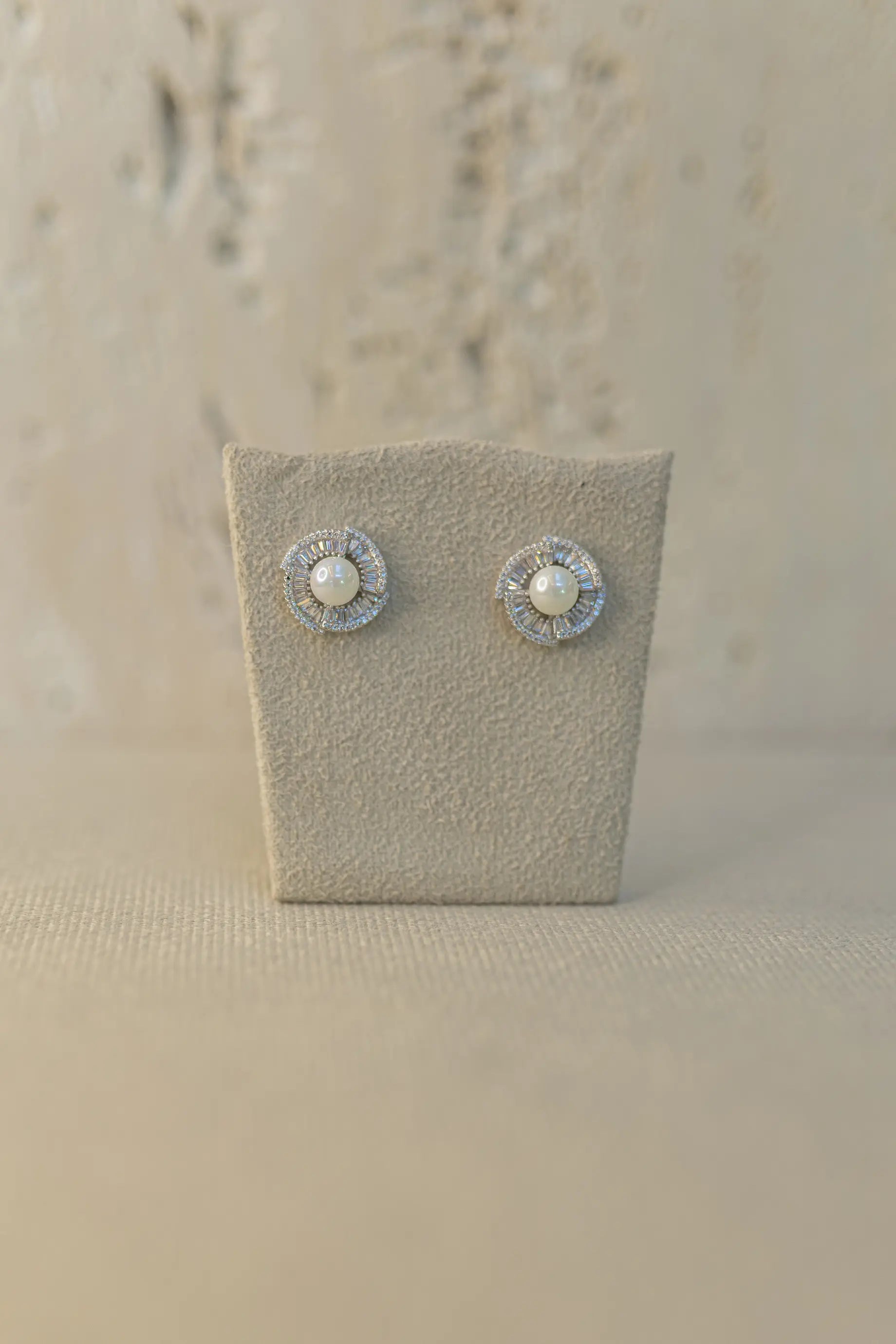 Brinco botão com borda de zircônias na cor cristal e banho de ródio branco.