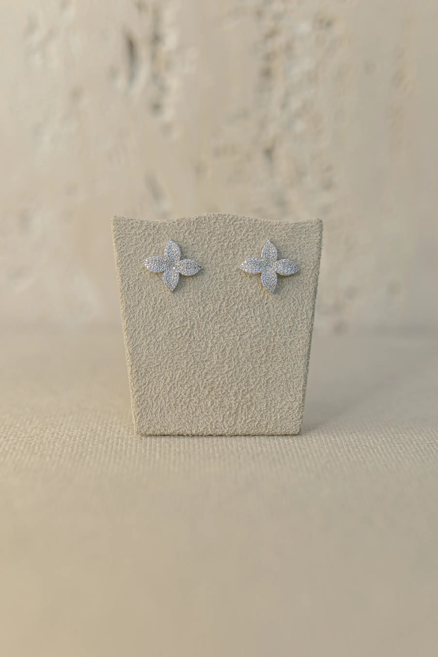 Brinco com design de flor camélia, todo cravejado de micro zircônias na cor cristal.
