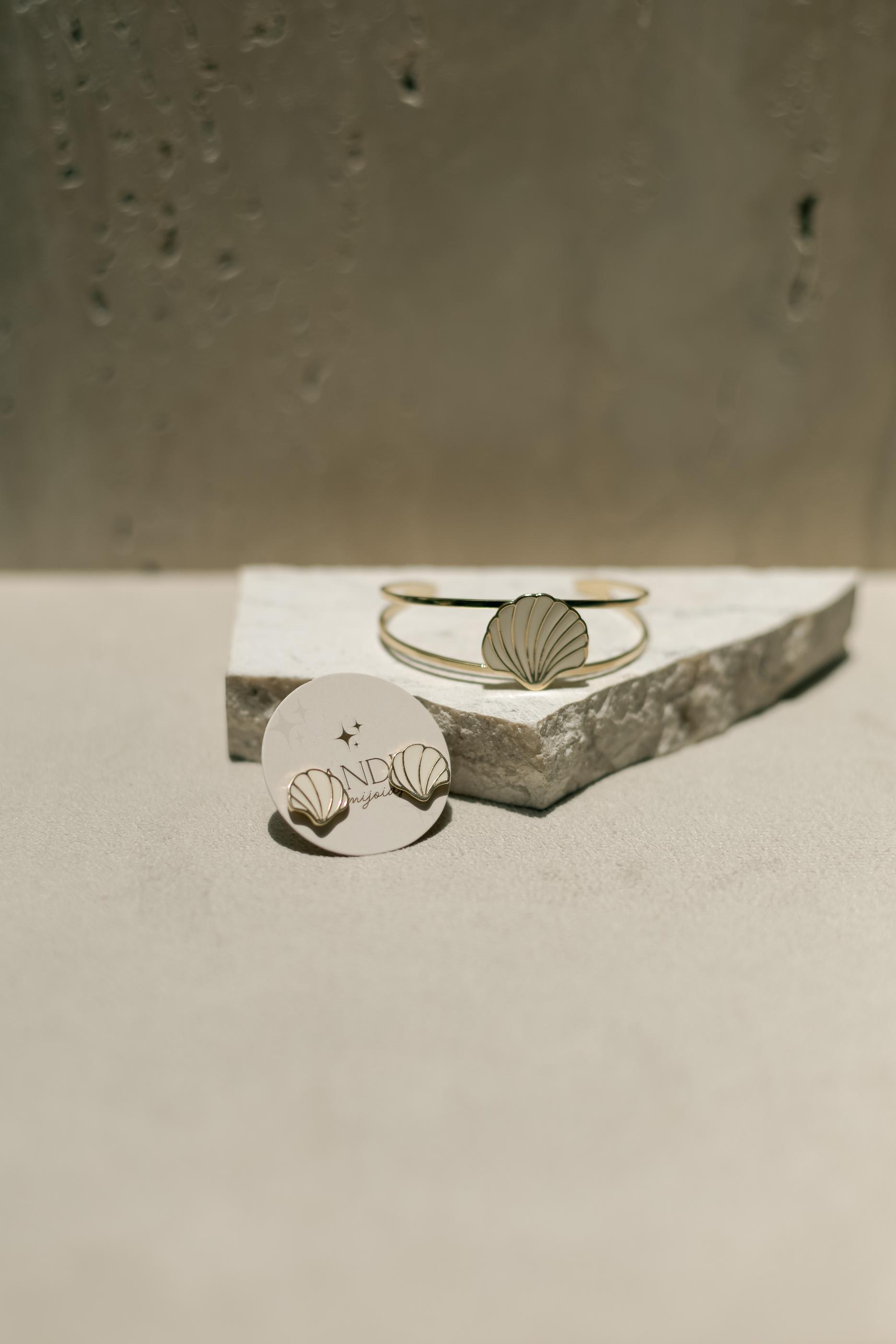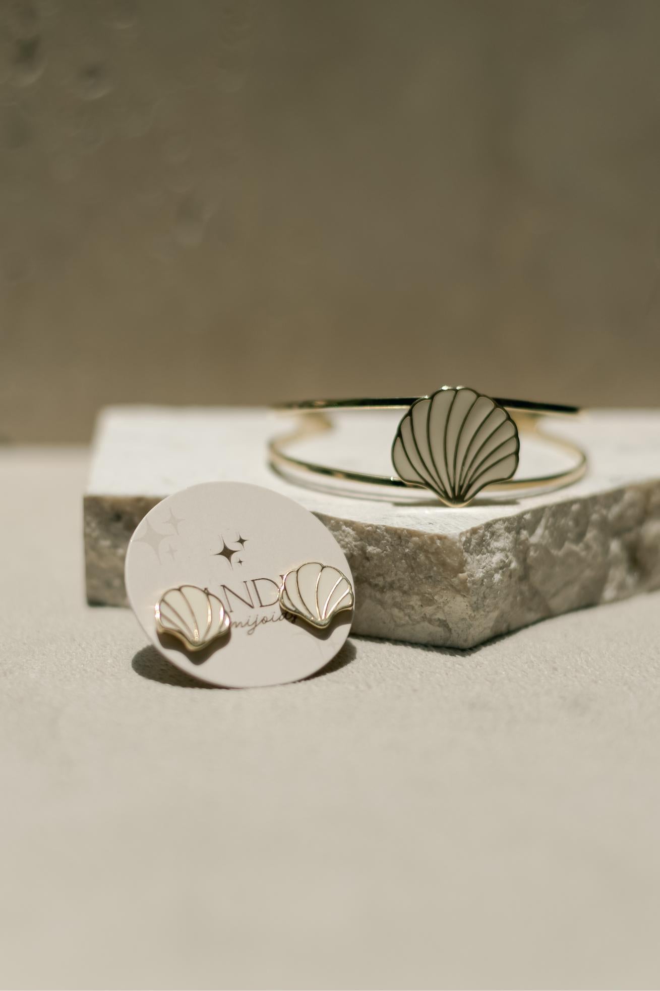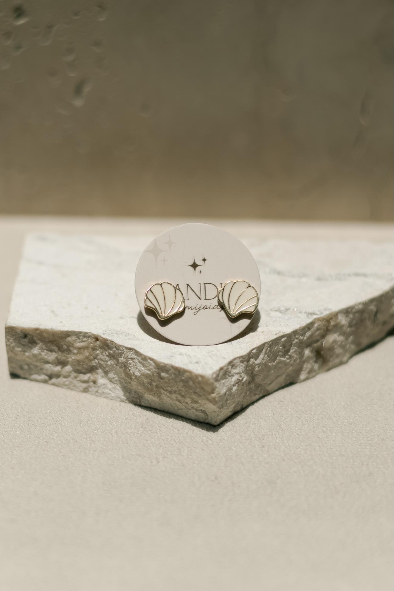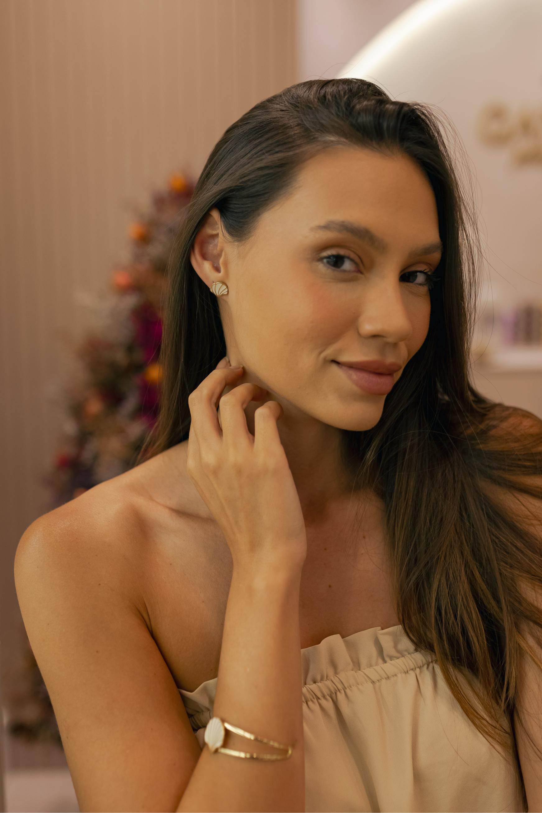 Brinco no formato de concha com esmaltado na cor Off White no banho de ouro 18k.