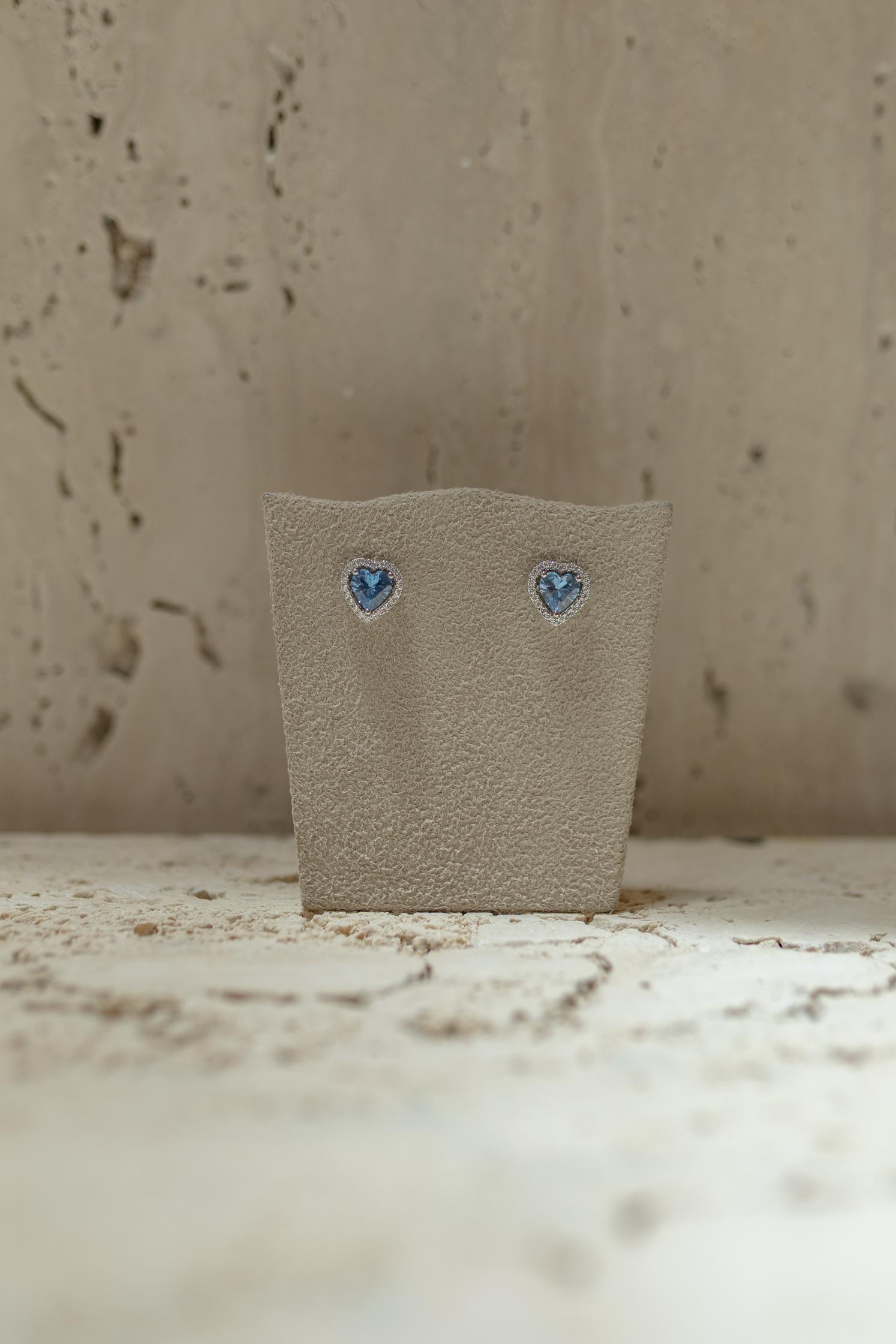 Brinco Coração Borda Cravejada Aquamarine Ródio Branco