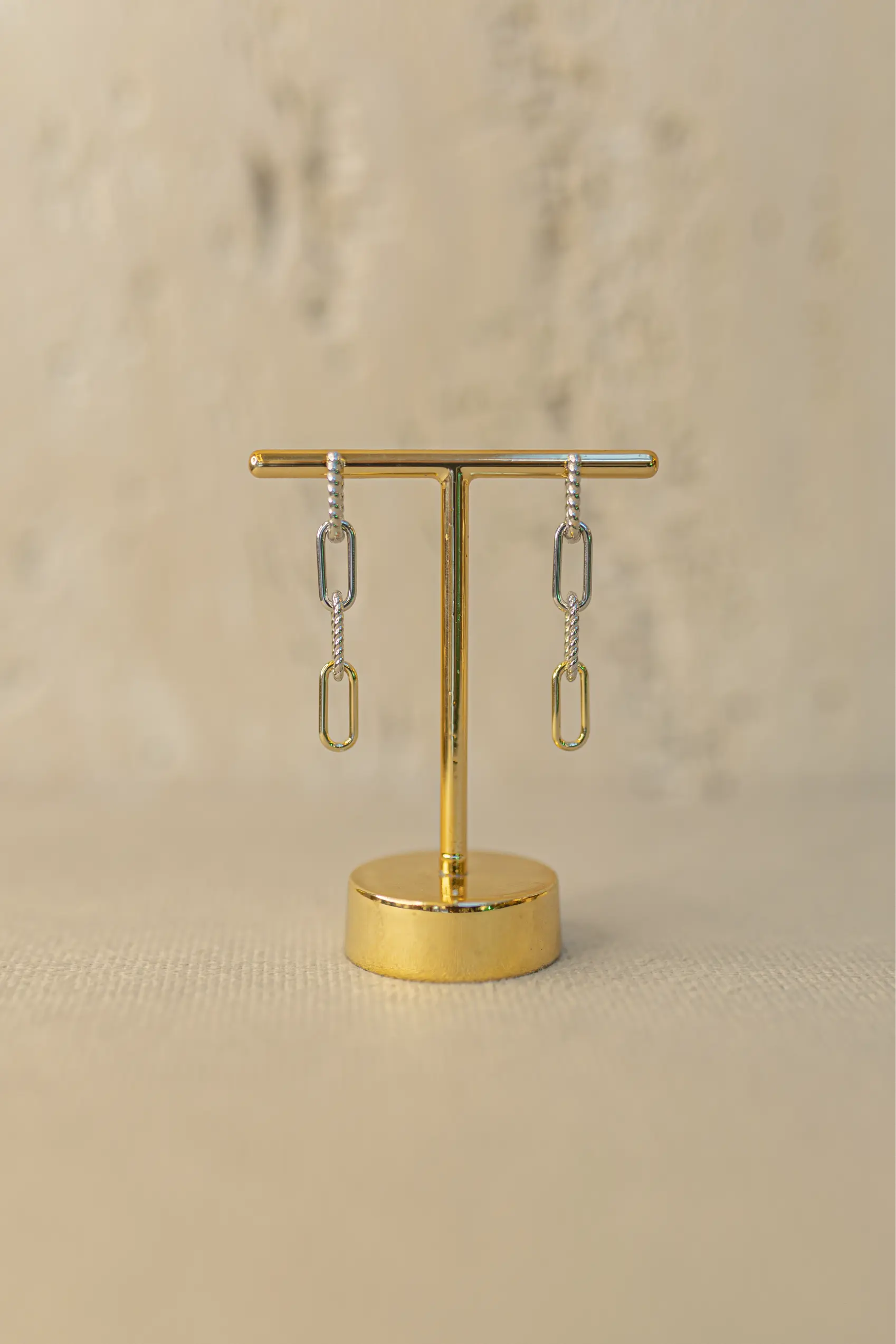Brinco com elos torcidos e lisos com mix de banhos (ouro e ródio branco).