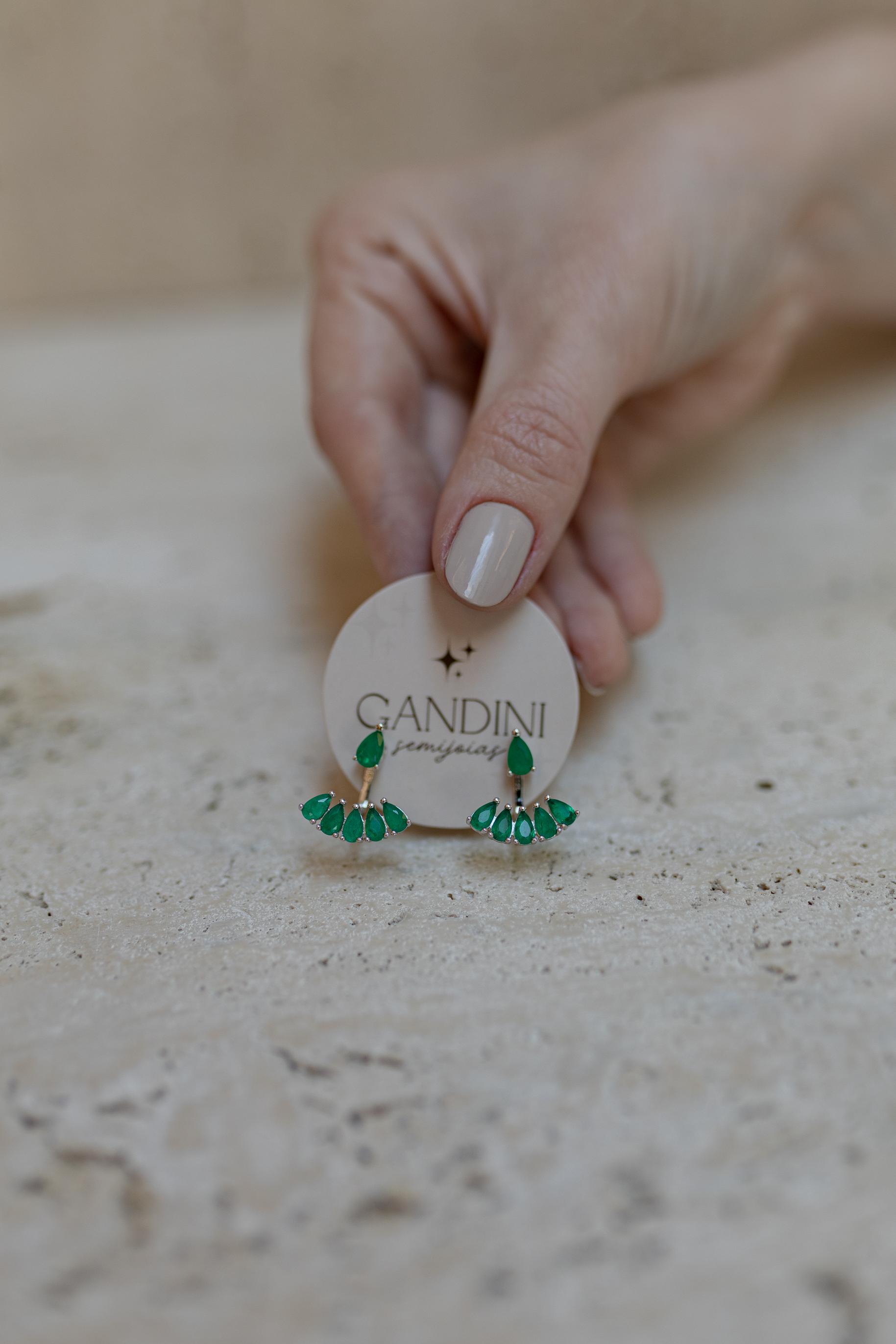 Brinco Ear Jacket Esmeralda 6 Gotinhas Prata 925 Ródio Branco