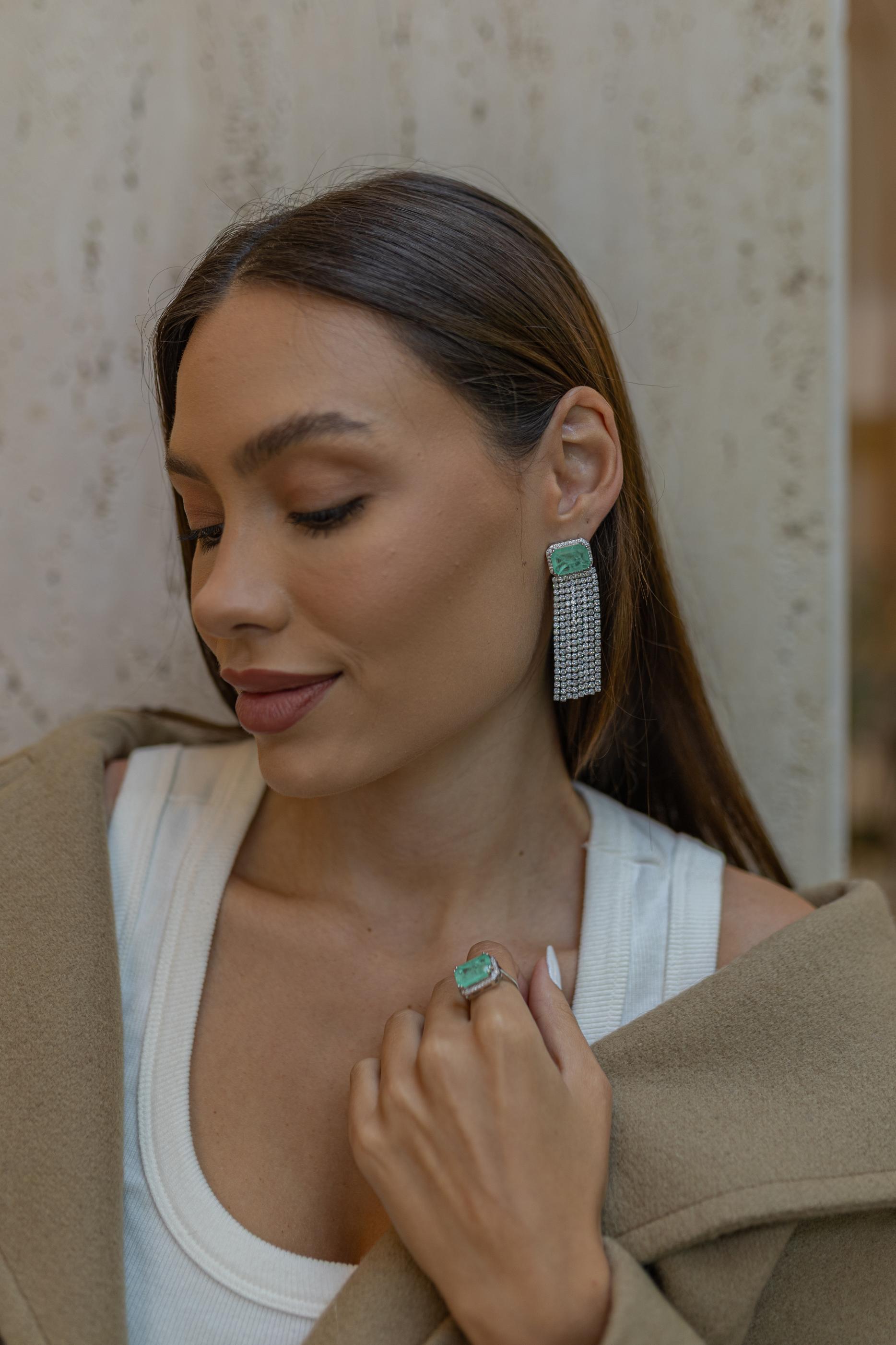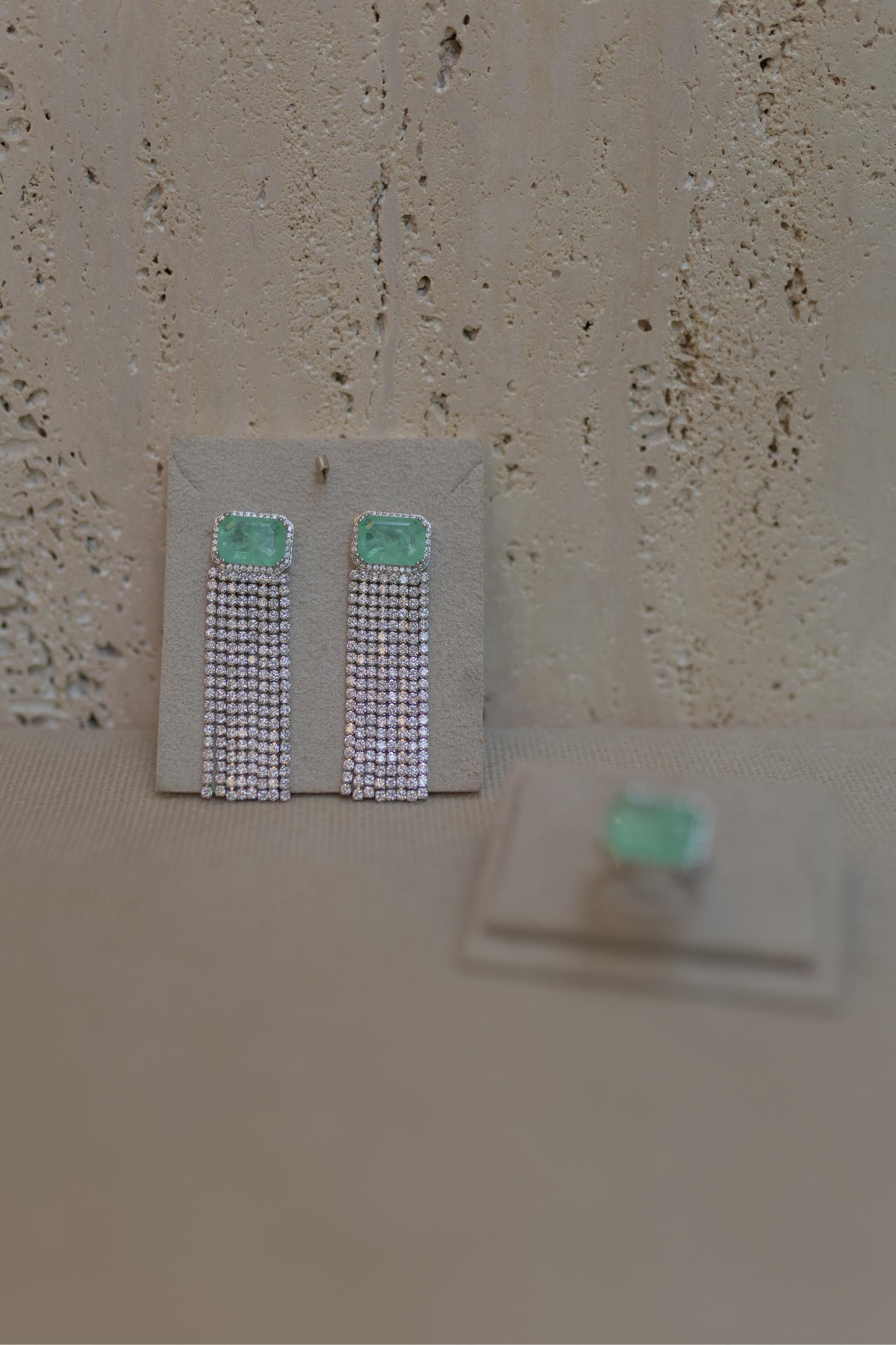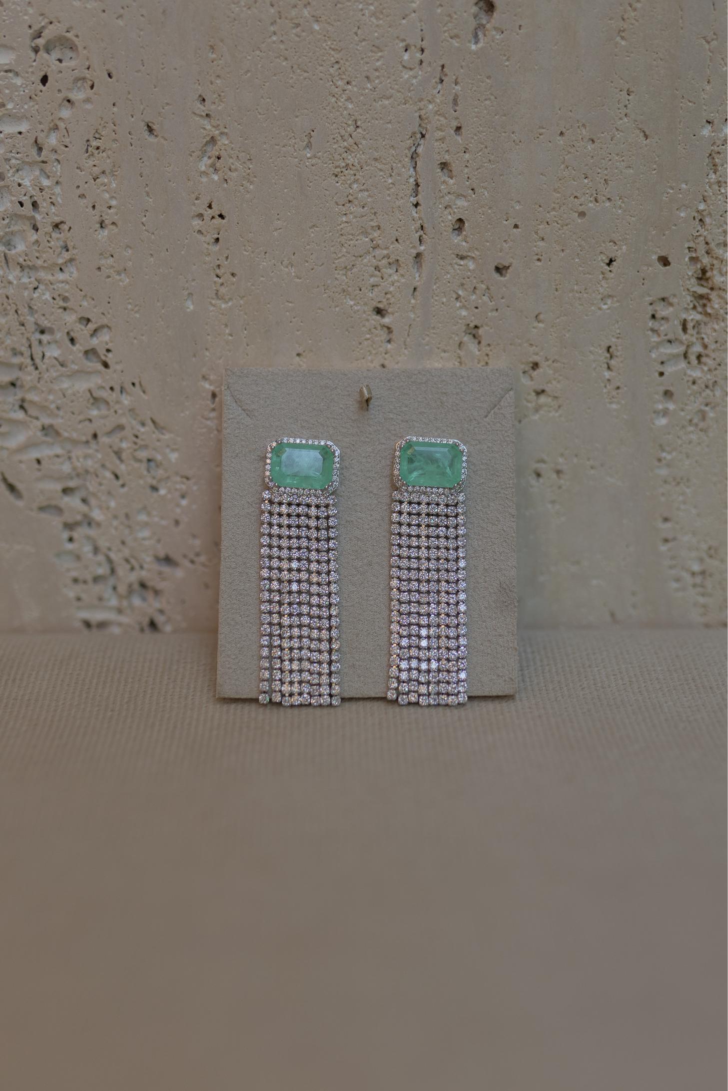 Brinco com pedra Esmeralda Colombiana no formato retangular e franja com microzircônias cristal no banho de ródio branco.